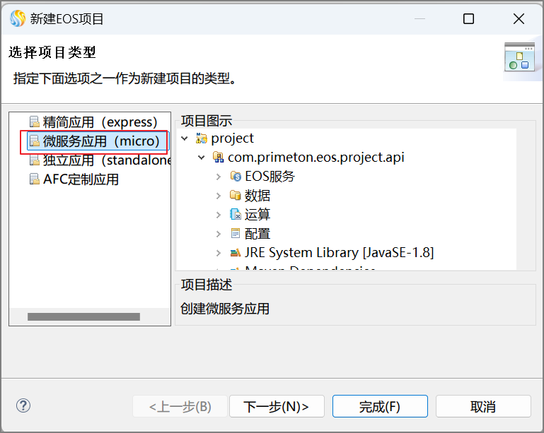 在IDE界面左上角,单击文件>新建>EOS项目。然后选择微服务应用,单击下一步。