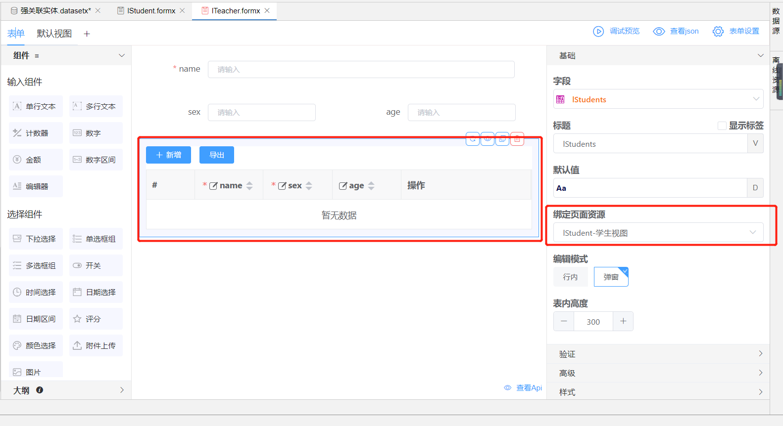 示例场景一:学生信息表单页面使用页面容器绑定教师信息表单资源,在查看学生详细信息时展示出该名学生班主任的信息(注:此时,教师与学生的实体模型关系为双向1:n,为页面容器绑定教师实体字段即可);
