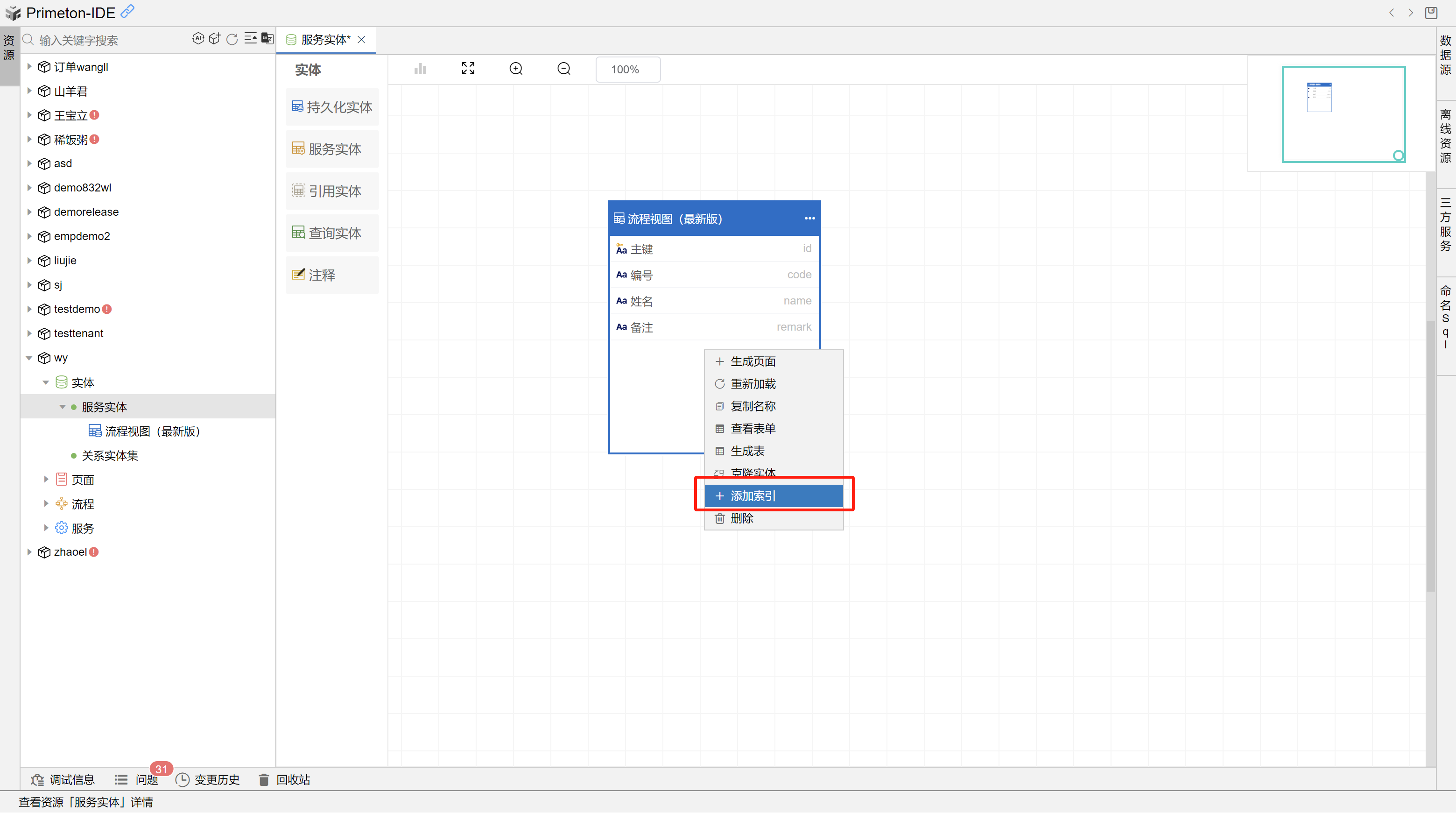 打开创建实体的实体集。用户可以从实体面板中拖拽所需的持久化实体到画布上,并配置持久化实体的属性。