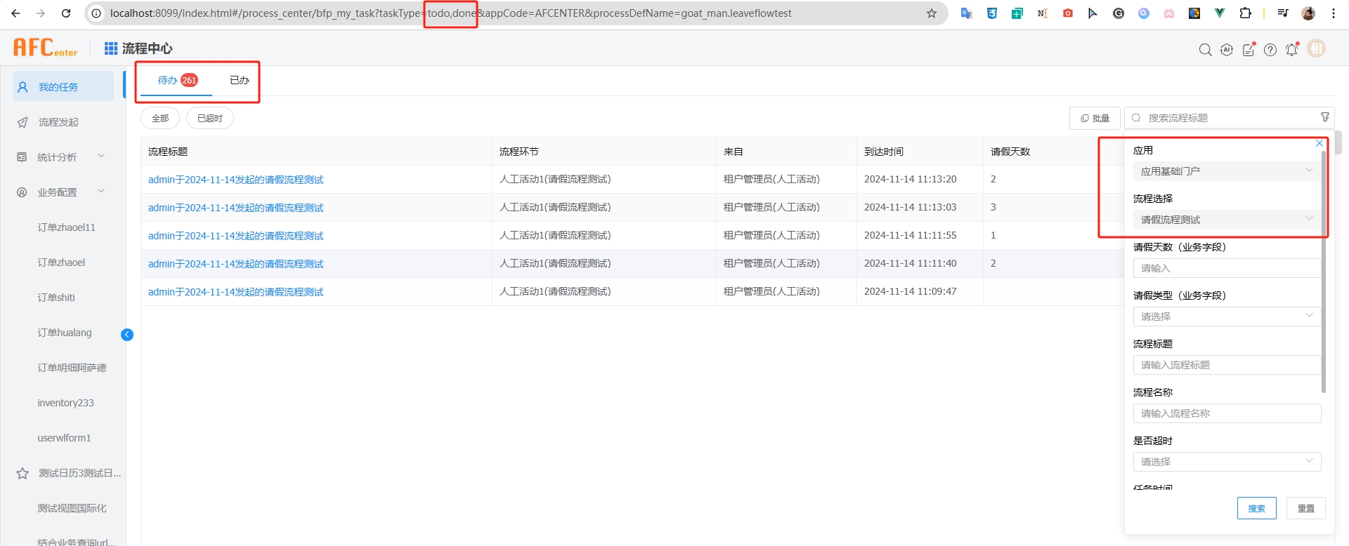 http://localhost:8099/index.html#/process_center/bfp_my_task?taskType=todo,done,apply&appCode=AFCENTER&processDefName=goat_man.leaveflowtest参数说明