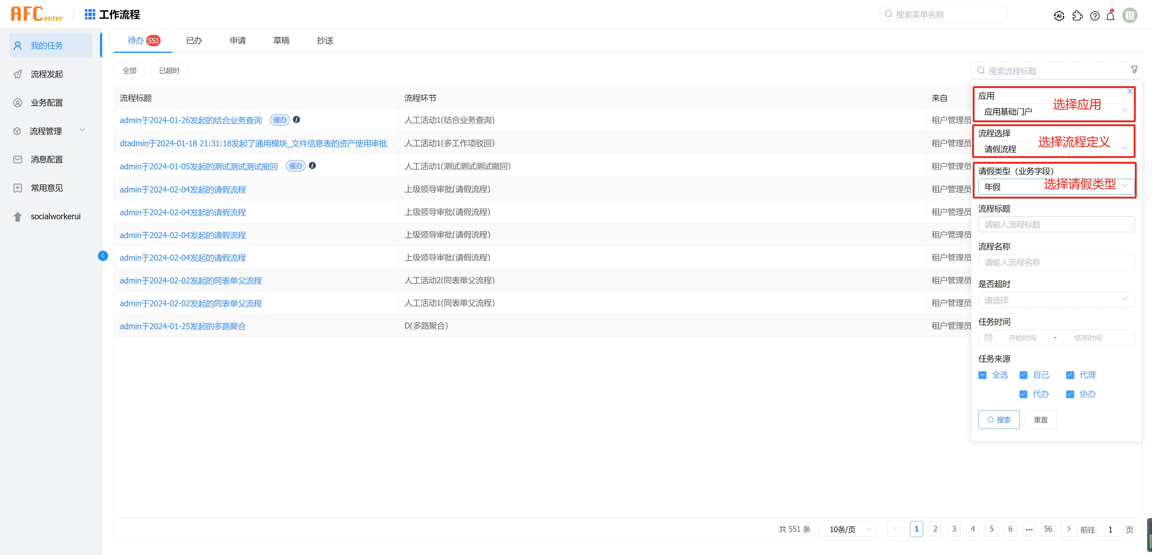 任务中心列表查询选择对应应用下的“请假流程”,即可出现配置的属性列作为查询结果或查询条件。 如下图以待办任务列表为例,已办、申请同理。