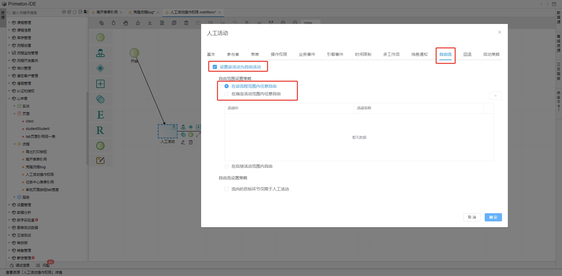 注:其中结束节点比较特殊,只有自由流中设置了结束节点,则在指定后继活动是就会出现,后继活动如果指定的是结束节点,则流程完成当前节点后就会结束。
