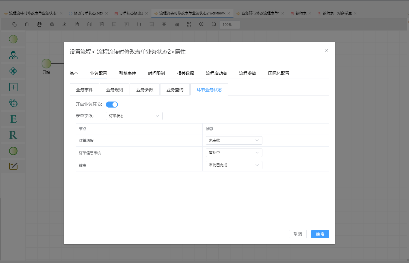 根据创建的表单创建流程流转时修改表单业务状态2流程,双击空白面板切换到业务环节tab页,开启业务环节开关, 选择表单字段为订单状态字段。每个节点可以选配业务字典的值,配置完成后,保存流程,提交相应节点就可以按照节点配置修改订单状态的值。