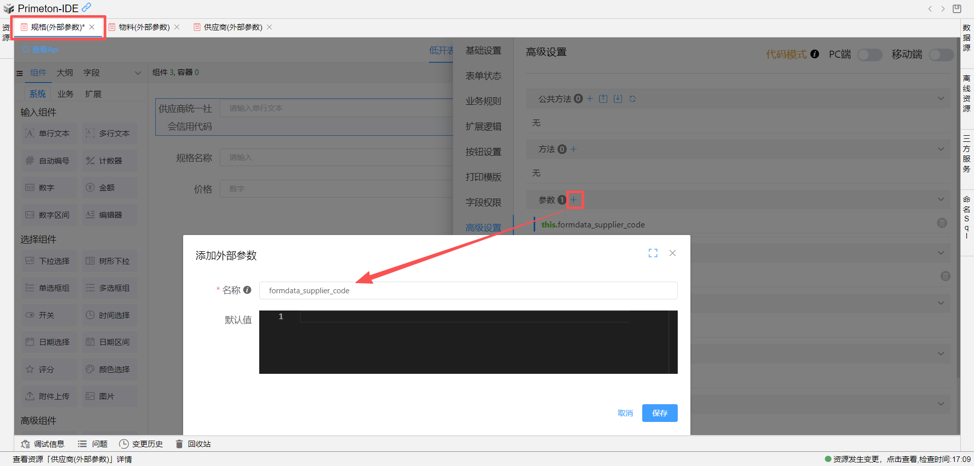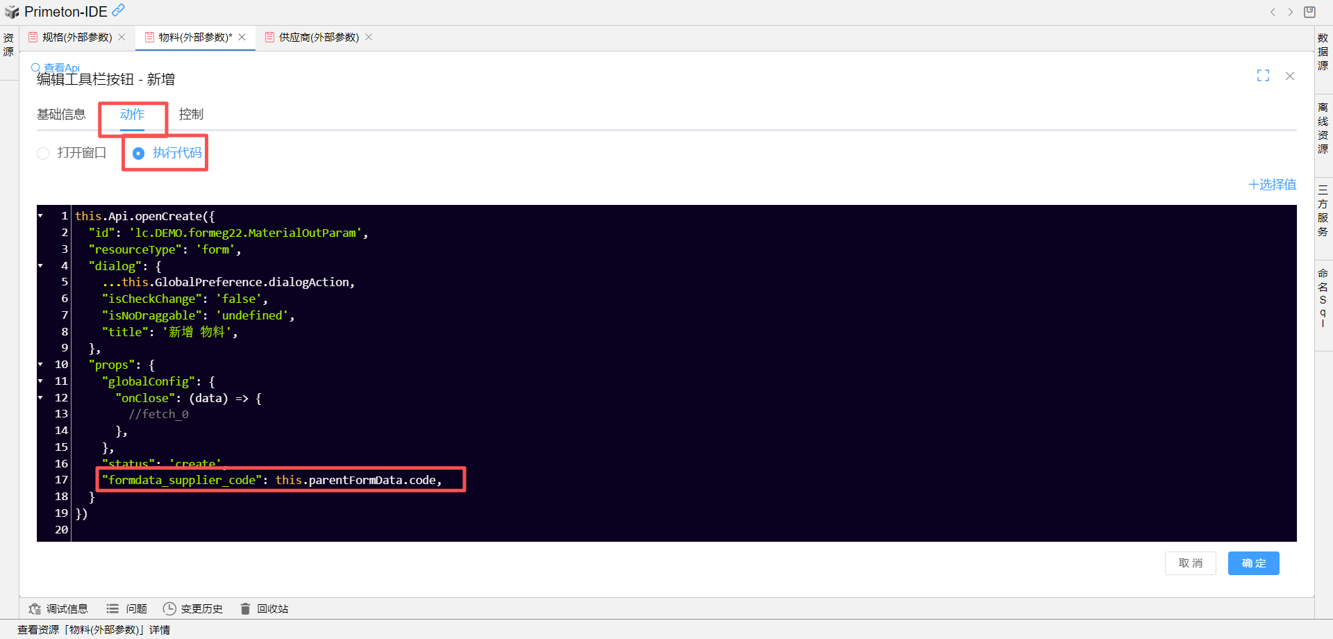 执行代码窗口中,获取父表单(物料表单)的供应商统一社会信用代码赋值(this.parentFormData.supplier_code)给规格表单中定义的外部参数formdata_supplier_code