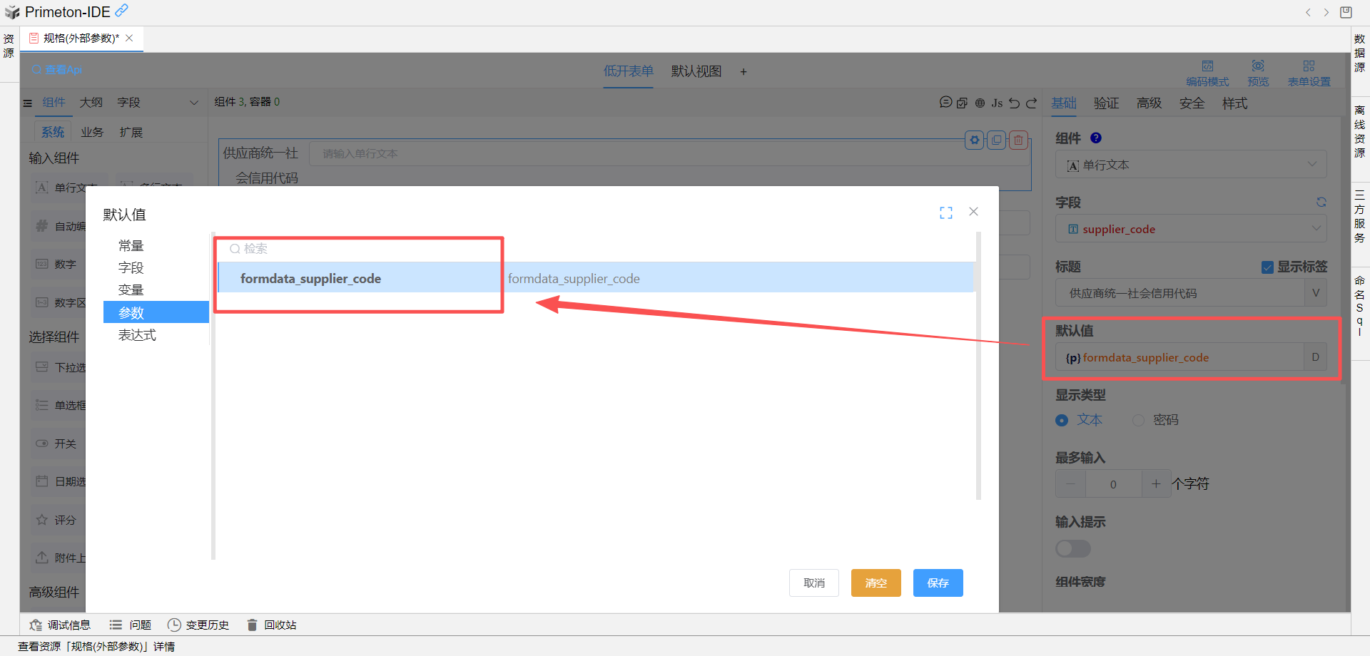 formdata_supplier_code设置为规格表单的供应商统一社会信用代码组件的默认值。![]()