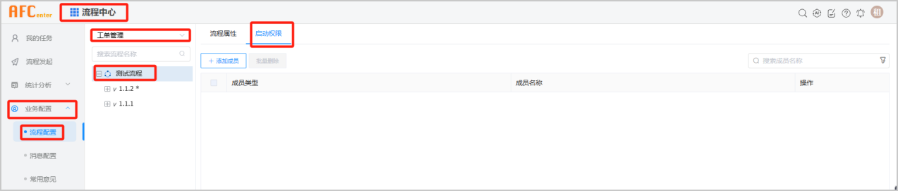 点击启动权限,再单击添加成员。可以选择为员工、机构、角色或工作组开启该流程的启动权限。