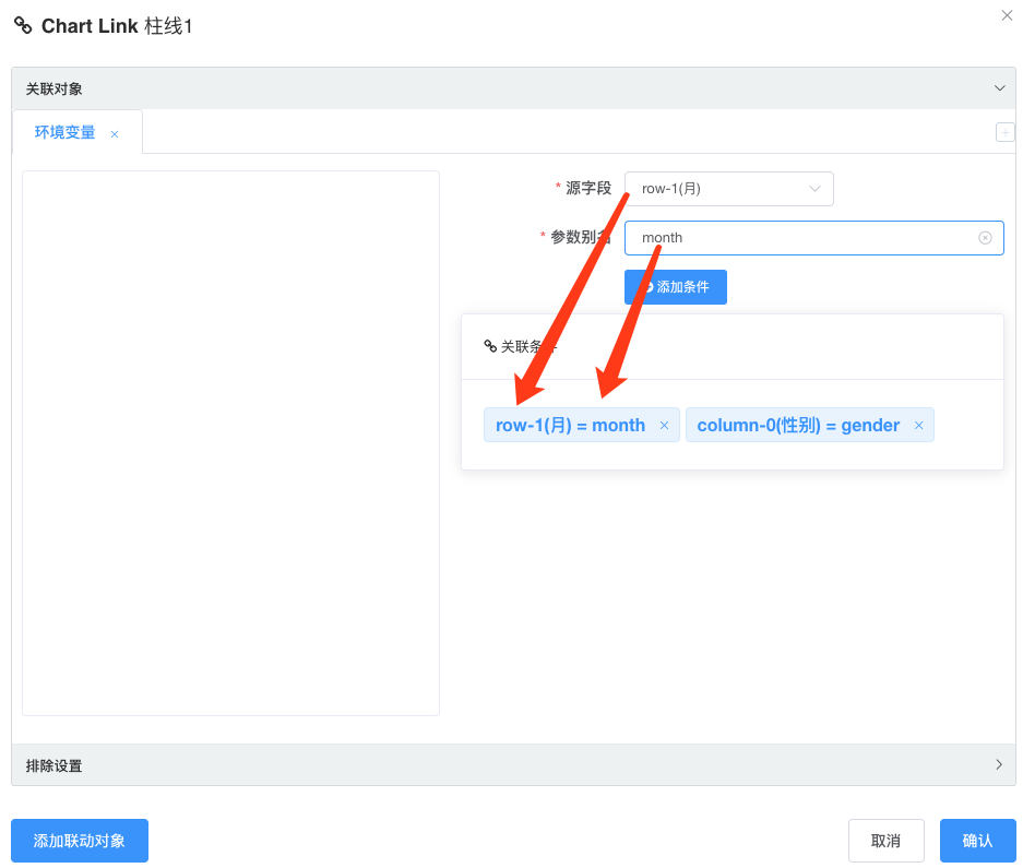 • 联动全局设置: 默认排除自身, 此外还可以选择排除其他的图表不响应联动时间;