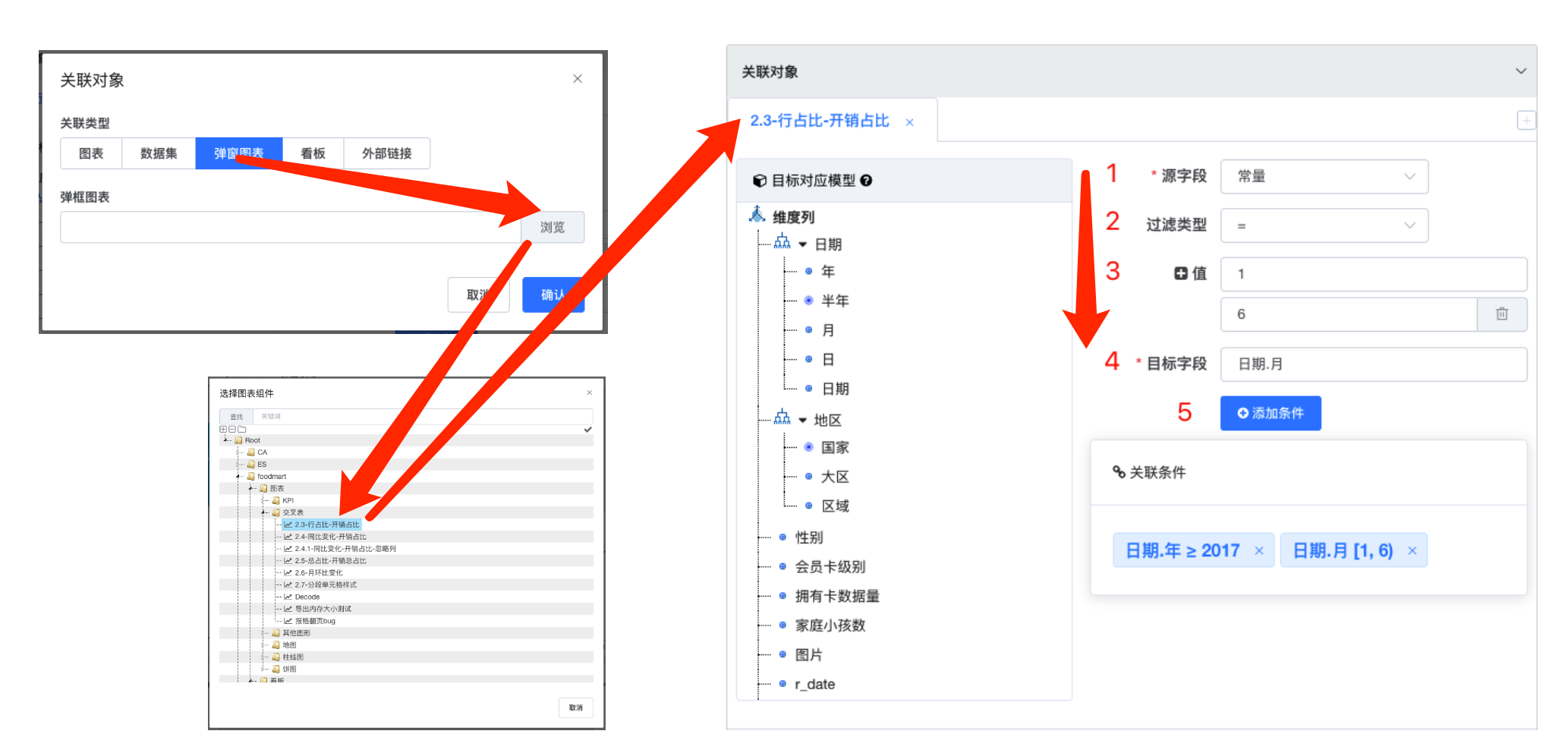 5. 选择源字段(来自源图表行列维度), 对于 KPI 指标卡之类没有行列维度在图上显示的可以选择常量