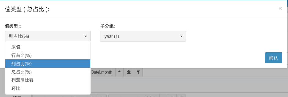 2 跳出弹出框, 值类型依旧选择列占比, 然后子分组选择年对应的字段year