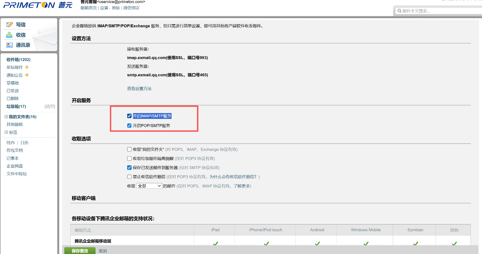 检查收发件箱的服务开启:开启IMAP/SMTP服务、开启POP/SMTP服务