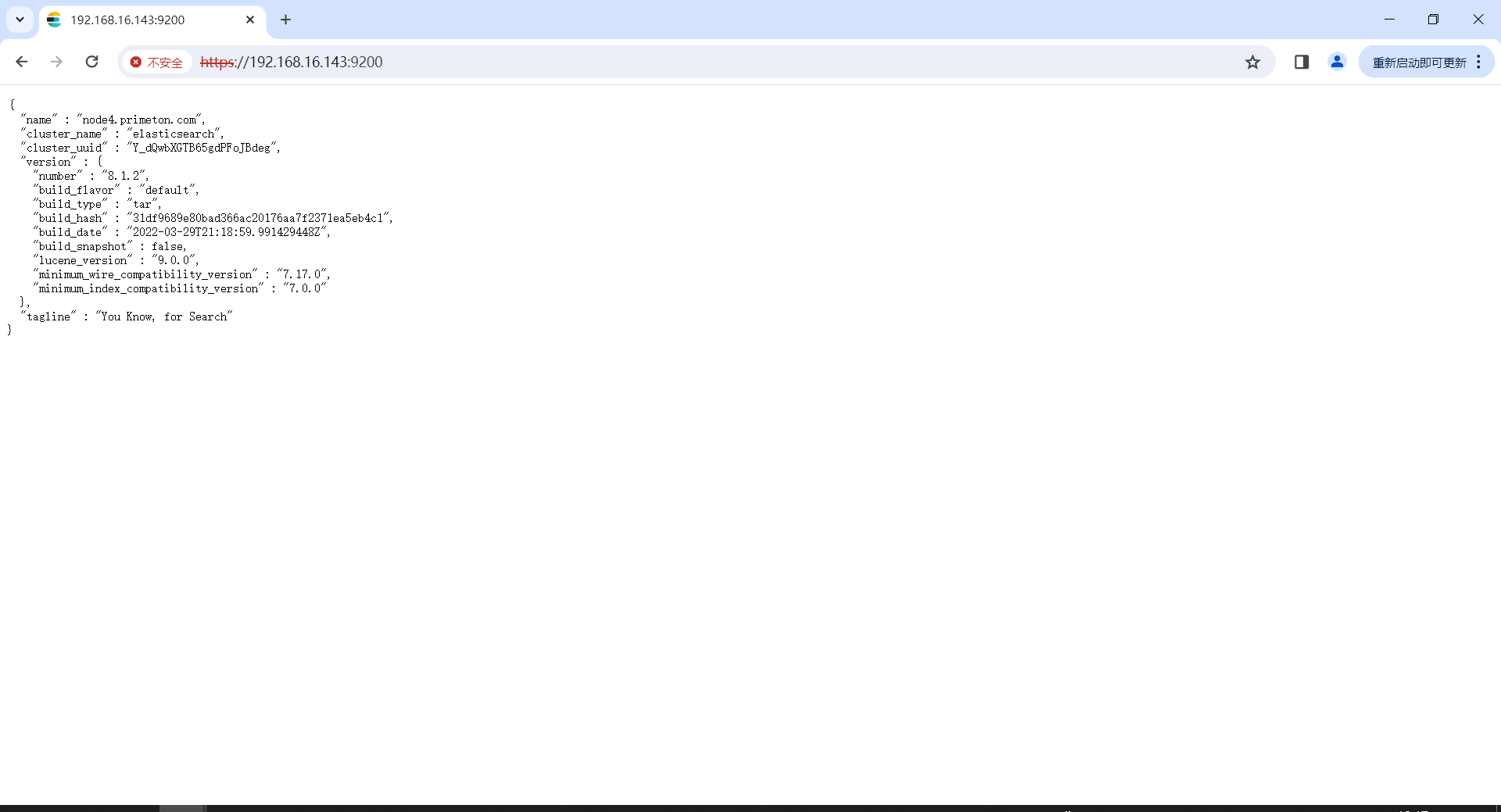 https://[ip]:9200,ip为安装elasticsearch的服务器的实际IP地址,显示如下界面:
