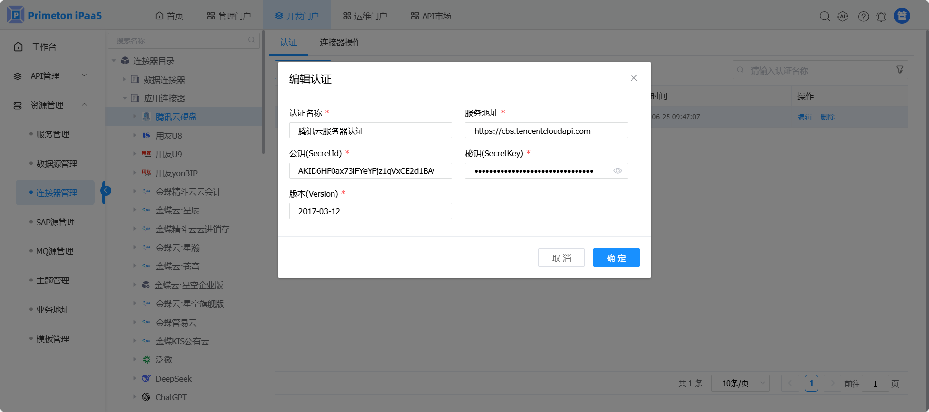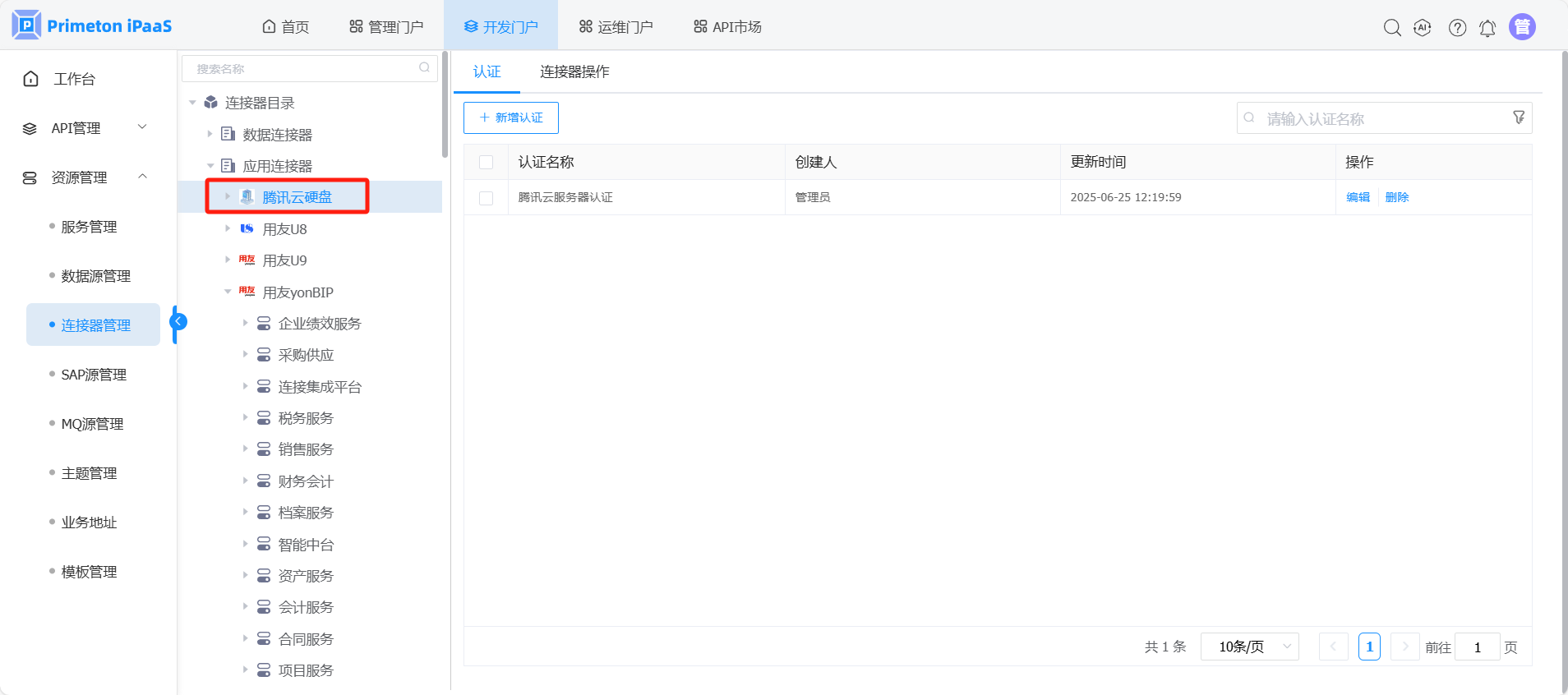 开发人员登录系统,进入开发门户,点击菜单“资源管理“ >“连接器管理” ,右侧区域显示 “连接器管理”界面。