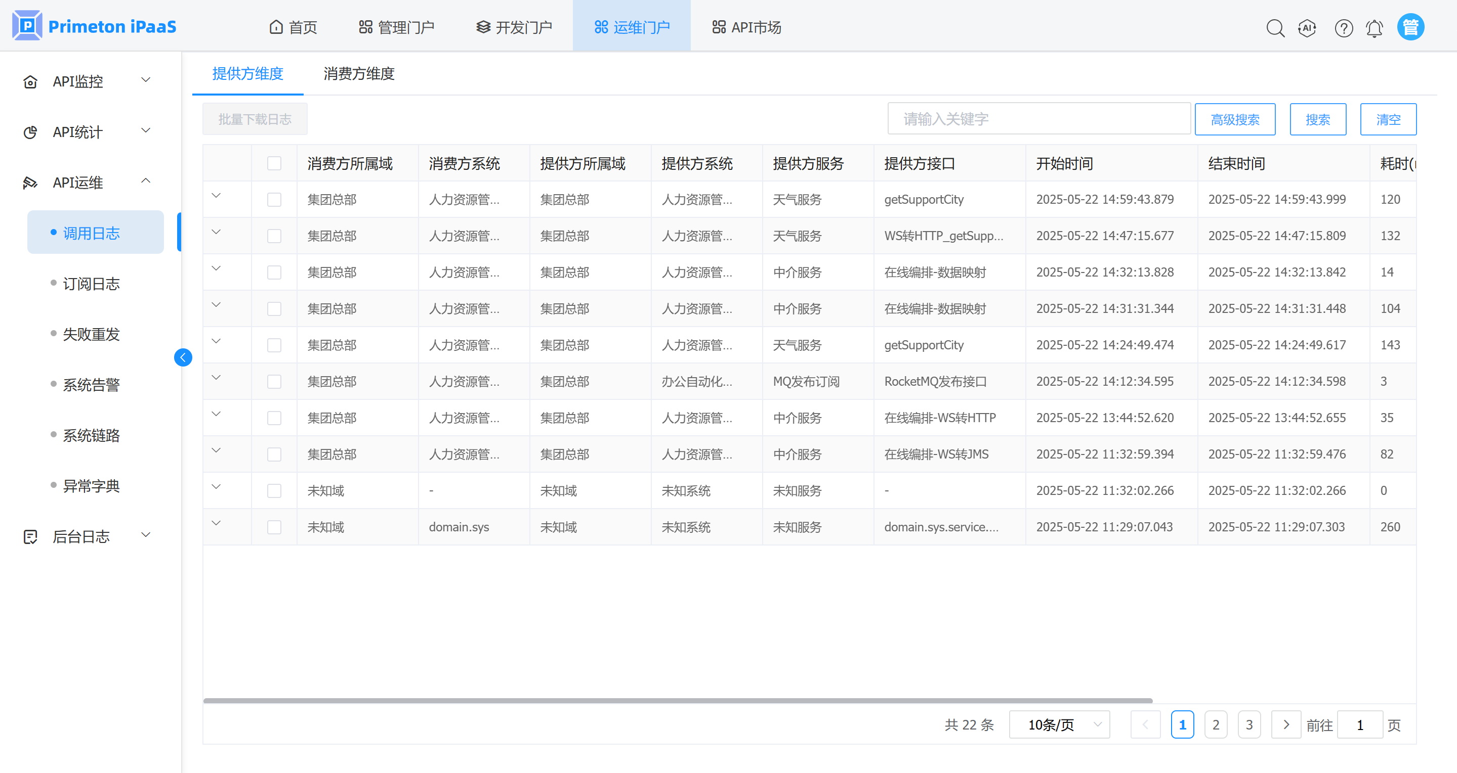 在运维门户,选择”API运维 -> 调用日志”菜单,进入到”调用日志”页面。