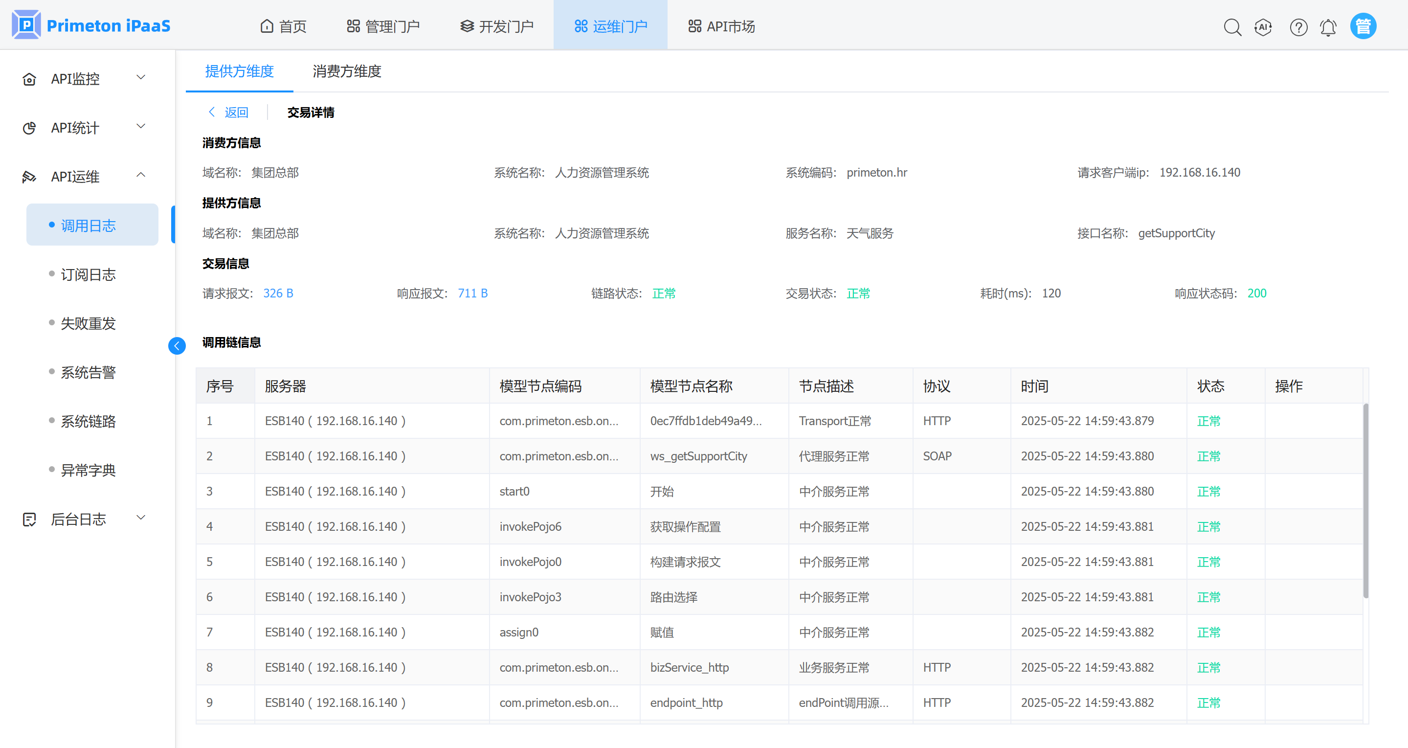 选择一条API调用记录,点击最右侧”操作”栏中的”详情”按钮,进入到”交易详情”页面,可以查看到API调用的详细信息。 点击页面左上角”返回”按钮,返回到”调用日志”页面。