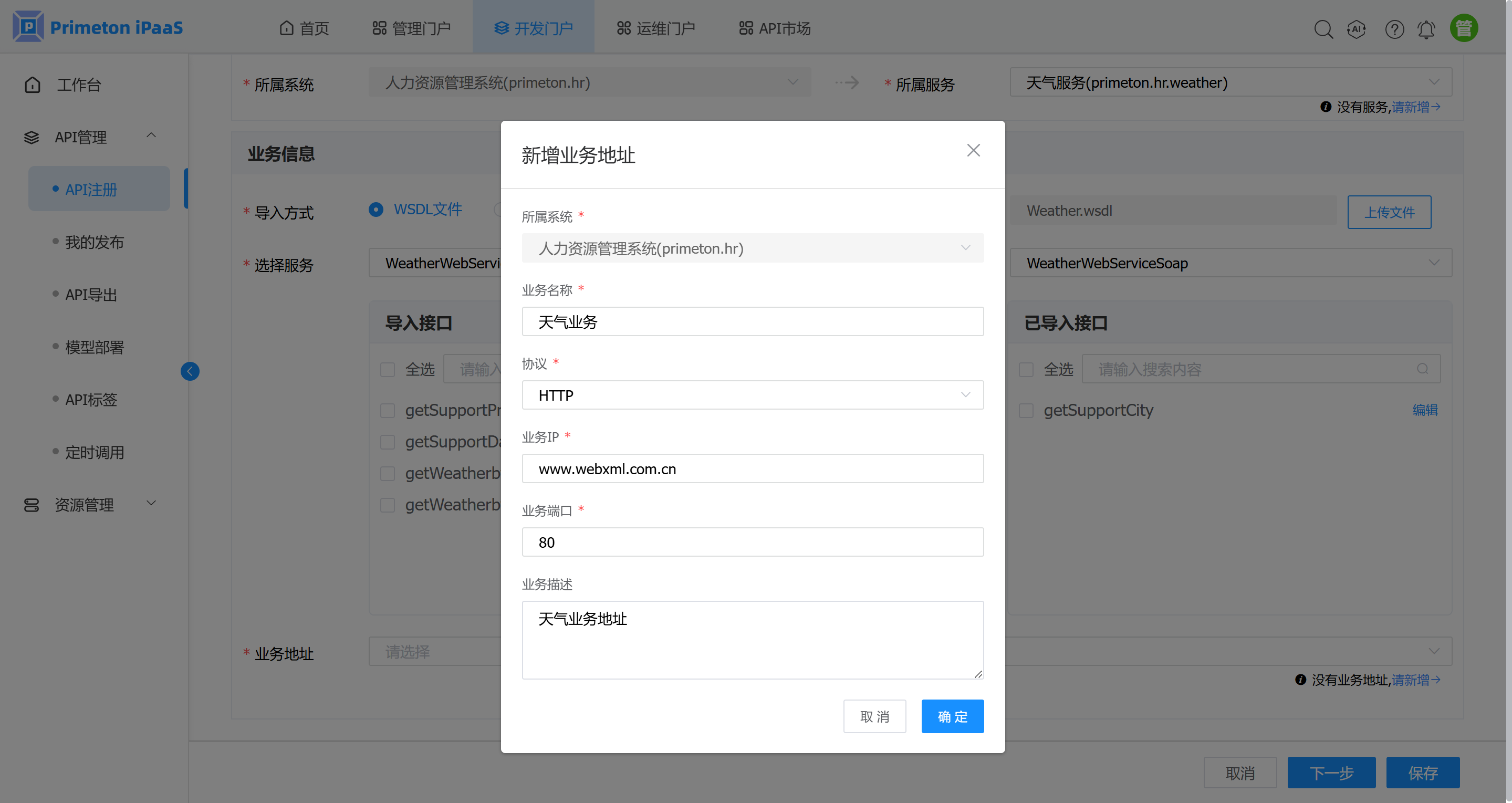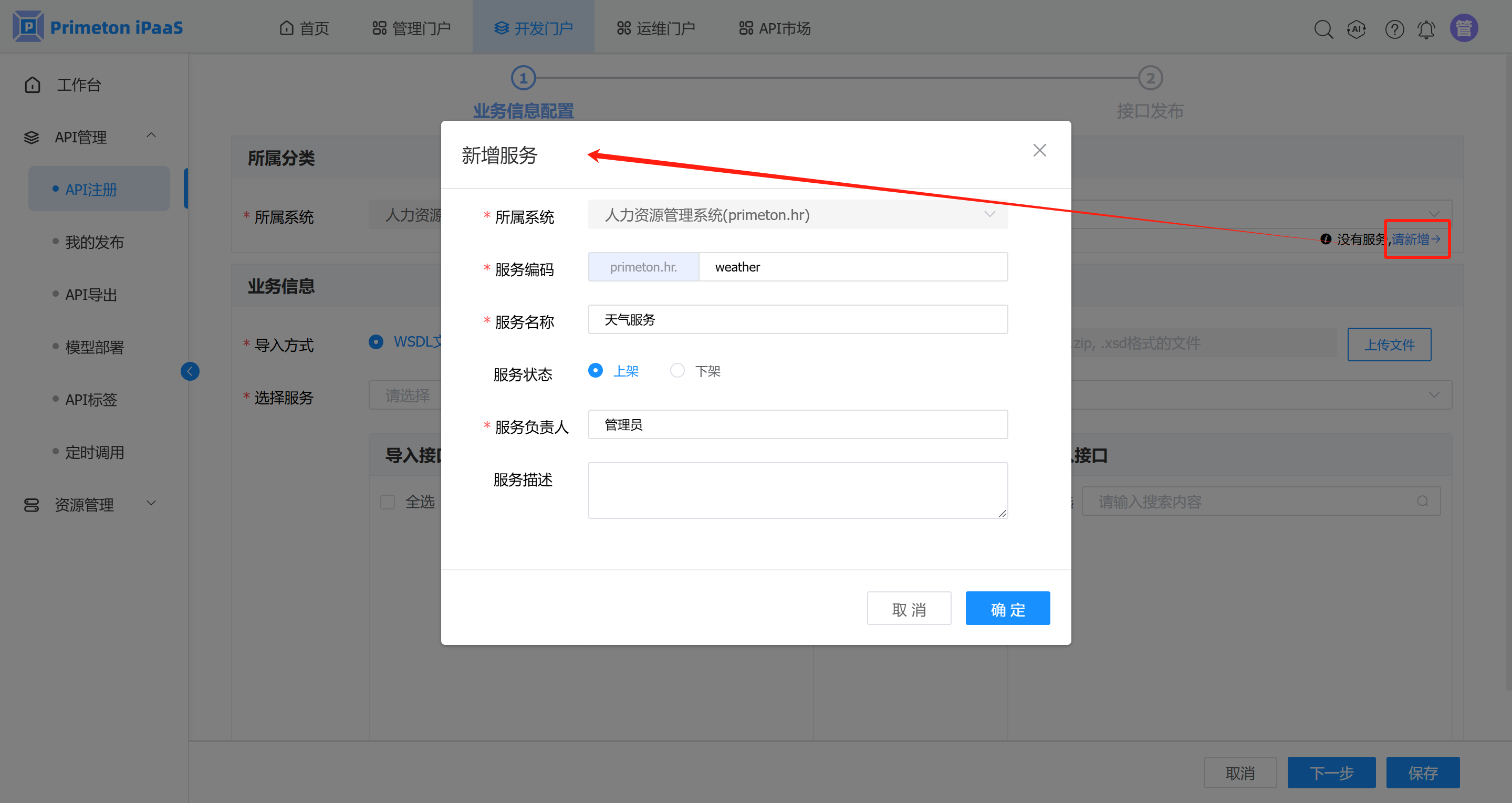 参数 说明 所属系统 API所属系统 所属服务 API所属服务,若没有对应服务,请新增服务 导入方式 WSDL文件和WSDL地址两种方式 选择服务 选择WSDL文件中所属的服务 选择Port 选择WSDL文件中所属的Port 业务操作 选择业务接口 业务服务地址 业务服务地址信息,若没有对应对应业务服务地址,请参考 步骤7 新增业务服务地址 在所属分类的所属服务处下拉选择”服务”。 如果当前没有配置”服务”,因此需要先点击所属服务下拉框下方的”请新增”按钮,进入到”新增服务”页面。 填写服务相关信息,点击”确定”按钮,完成新增服务。