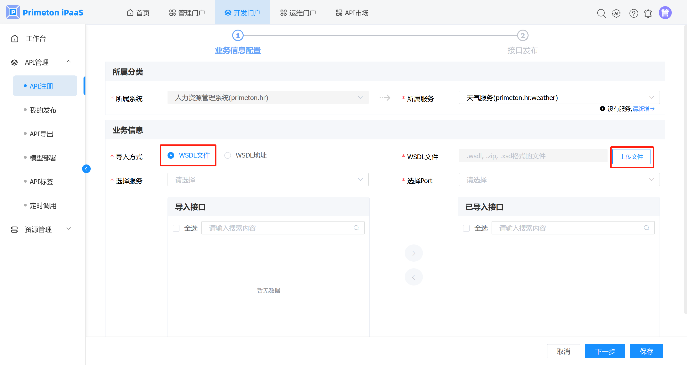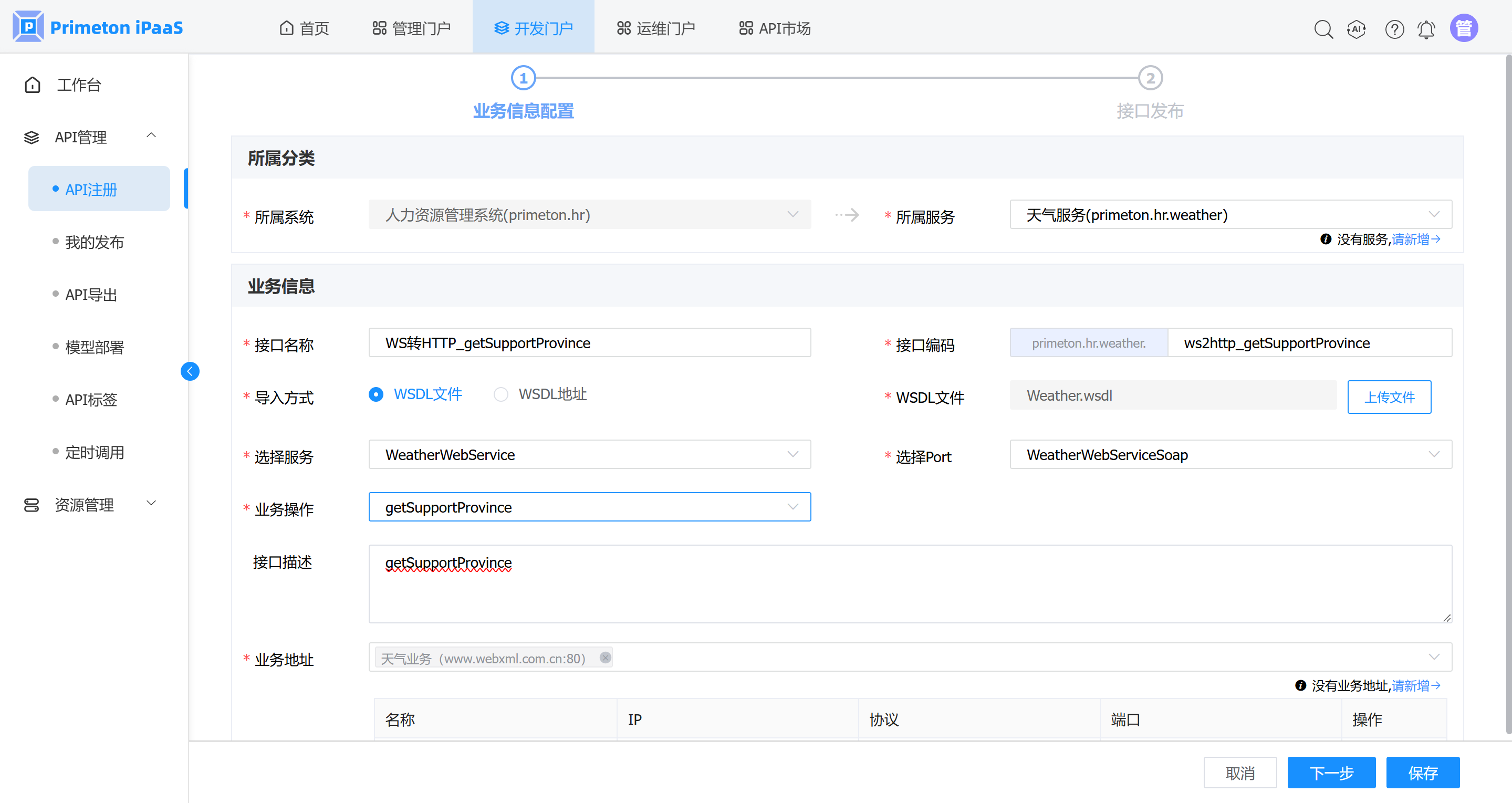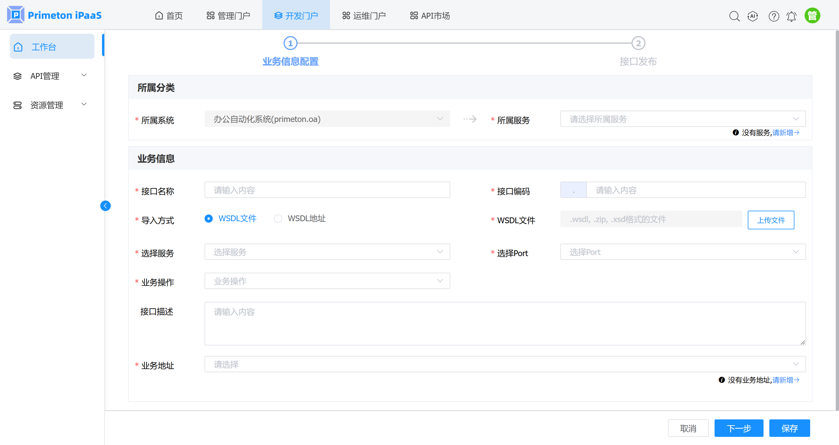 在业务信息模块的”WSDL文件”处,选择上传准备好的WSDL文件,即可完成接口导入。 ”WSDL地址”操作类似,可以直接填写WSDL地址进行接口导入。