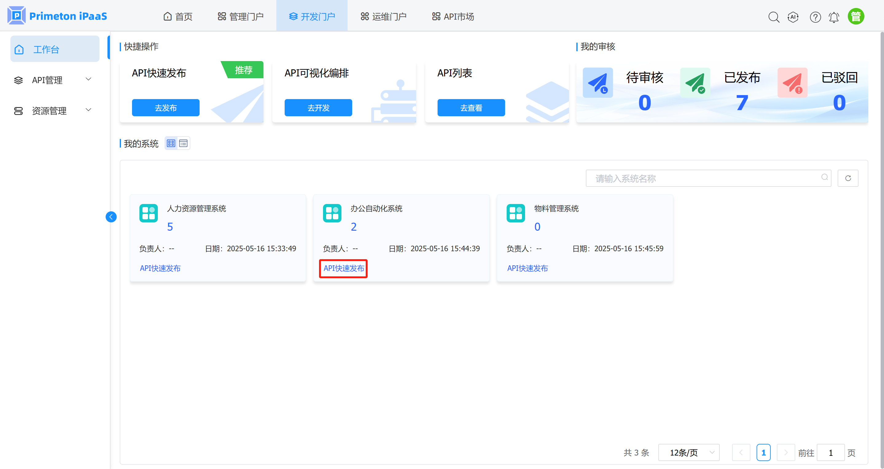 “工作台”页面,在“我的系统”页签中,点击系统卡片上的“API快速发布“按钮,弹出“API快速发布“弹窗。