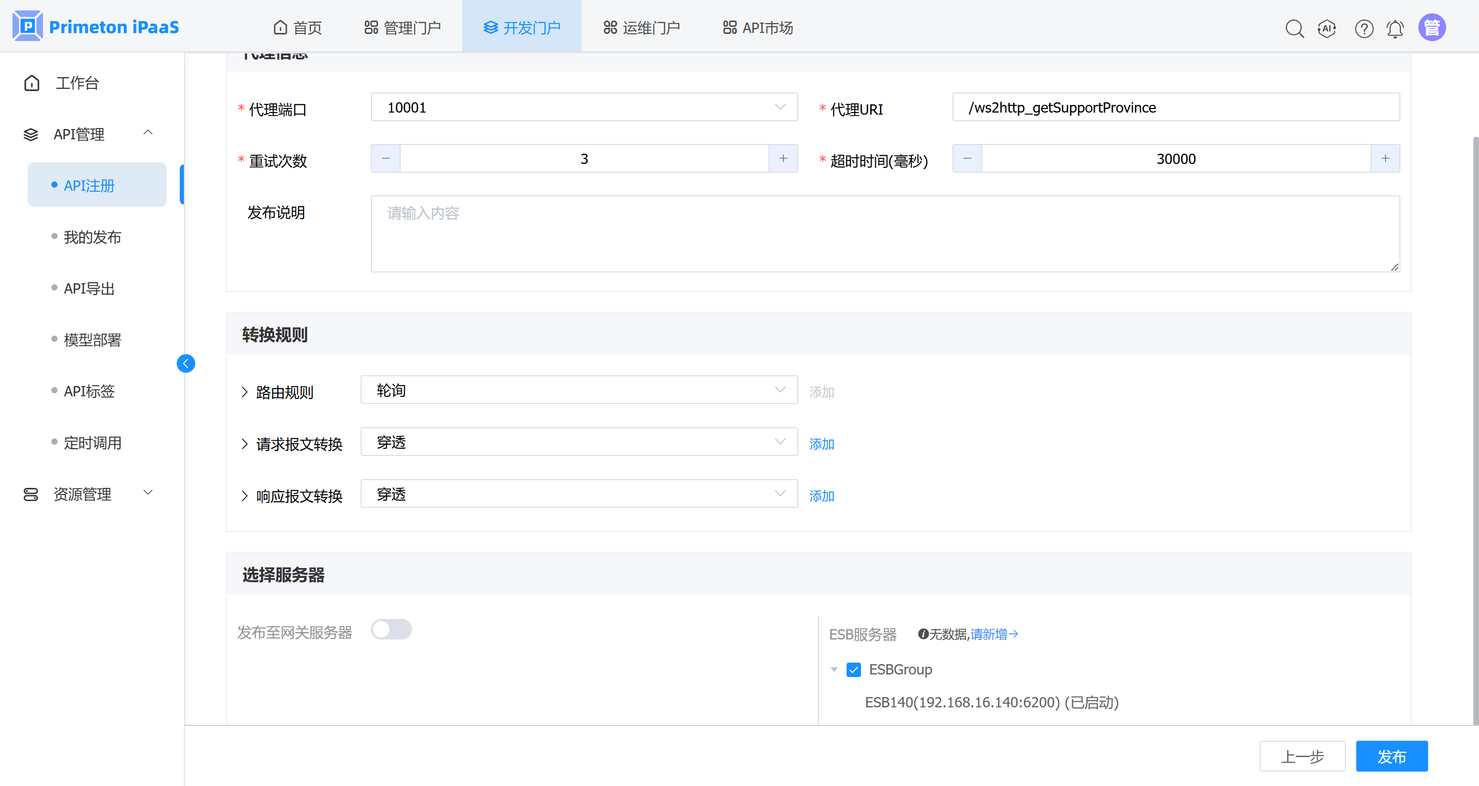 选择”代理端口”,填写”代理URI”,这里填写上一步选择接口的名称作为代理URI,选择ESB服务器,即可完成接口信息配置。
