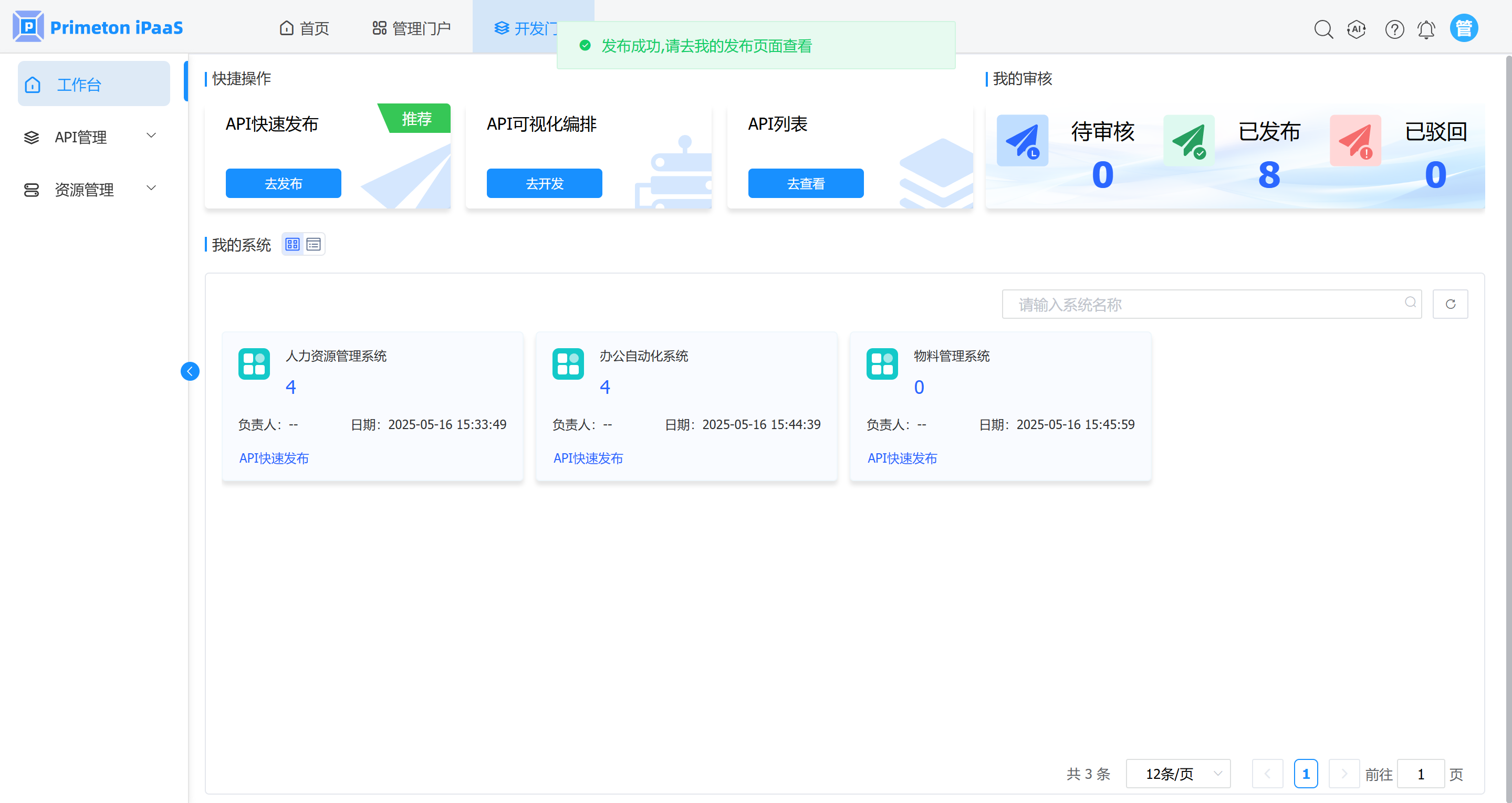 - 发布成功后,系统会自动跳转到”工作台”页面,显示发布成功信息。