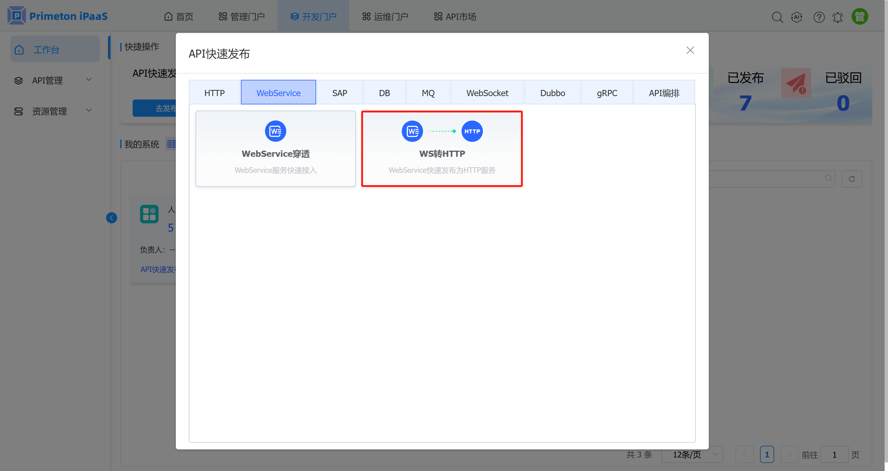 “API快速发布“弹窗,选择”WebService“页签,点击”WS转HTTP“按钮,进入”WS转HTTP“页面。