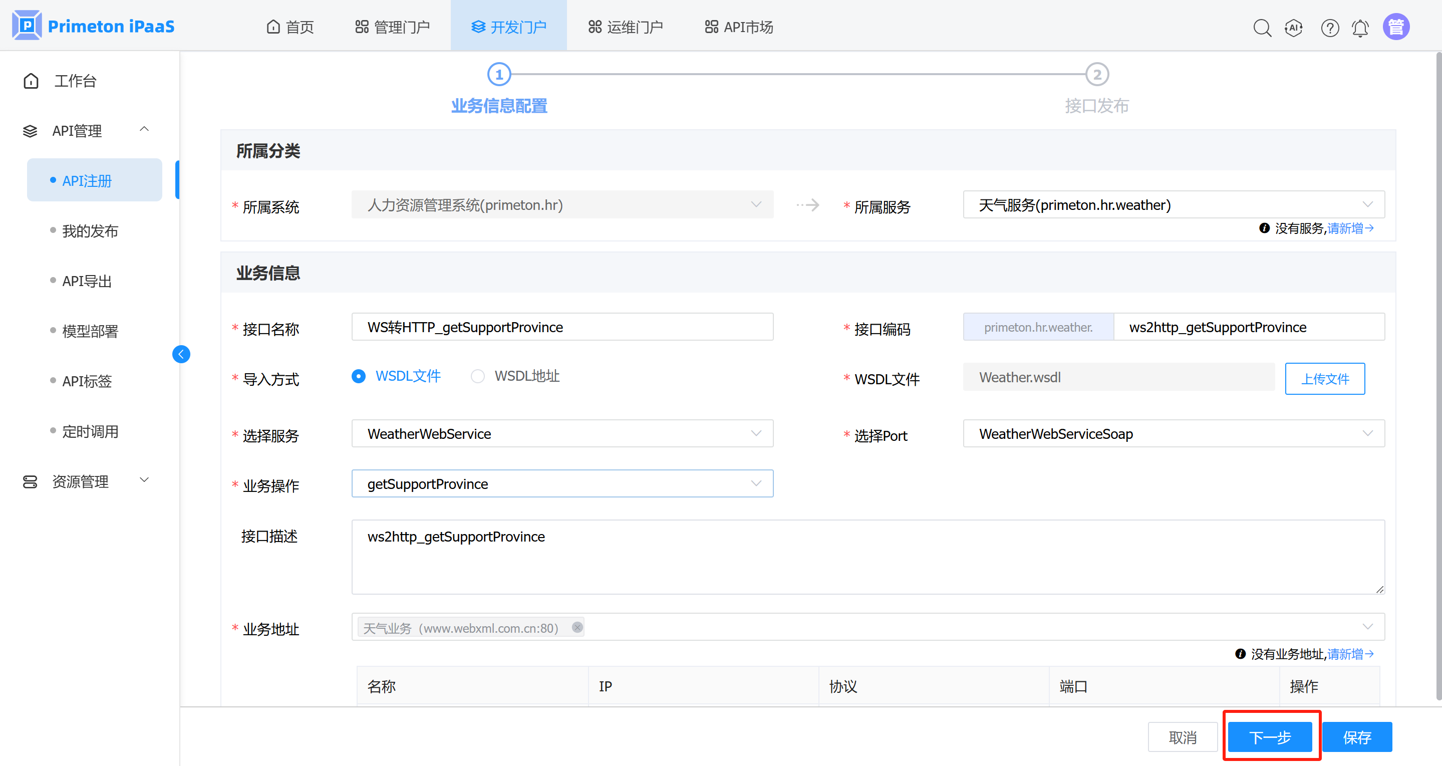 导入成功后,系统会自动解析接口信息,并在”选择服务”模块可下拉选择”WeatherWebService”。 依次下拉选择”选择服务”、”选择Port”和”业务操作”。