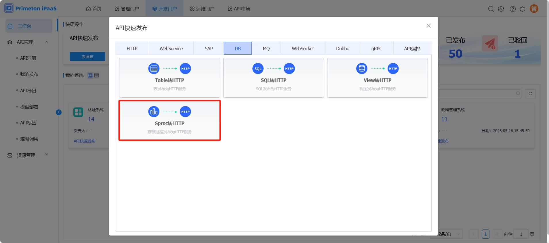3. “API快速发布“弹窗,选择”DB“页签,点击”Sproc转HTTP“按钮,进入”Sproc发布“页面。