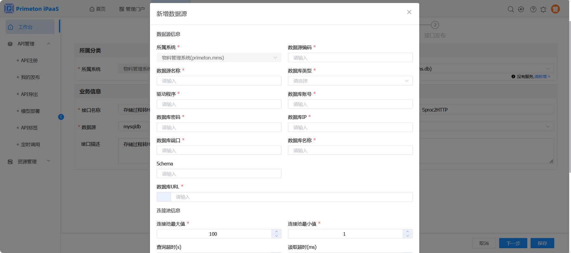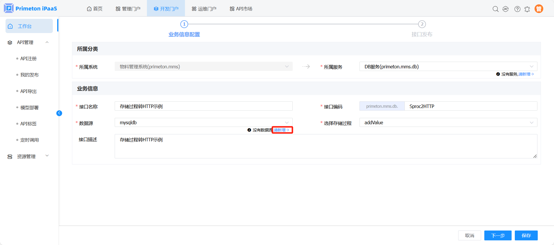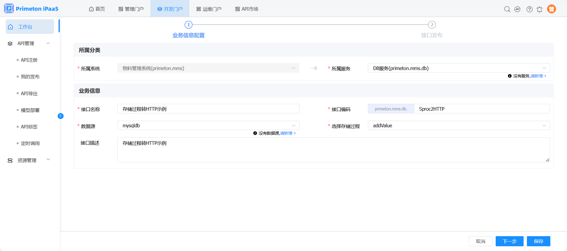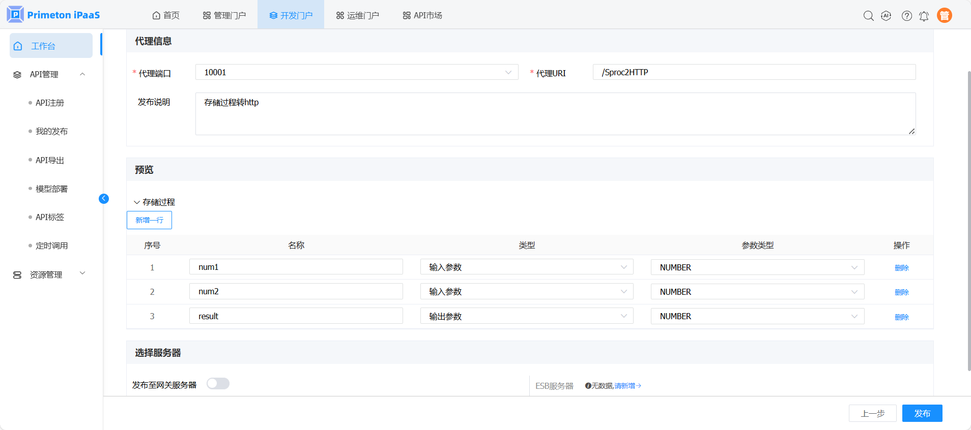 6. “业务信息配置”信息填写完成后,点击“下一步”按钮,进入“接口发布”页面,在接口发布页面填写相关参数,点击“发布”按钮,即可完成对存储过程的发布操作。