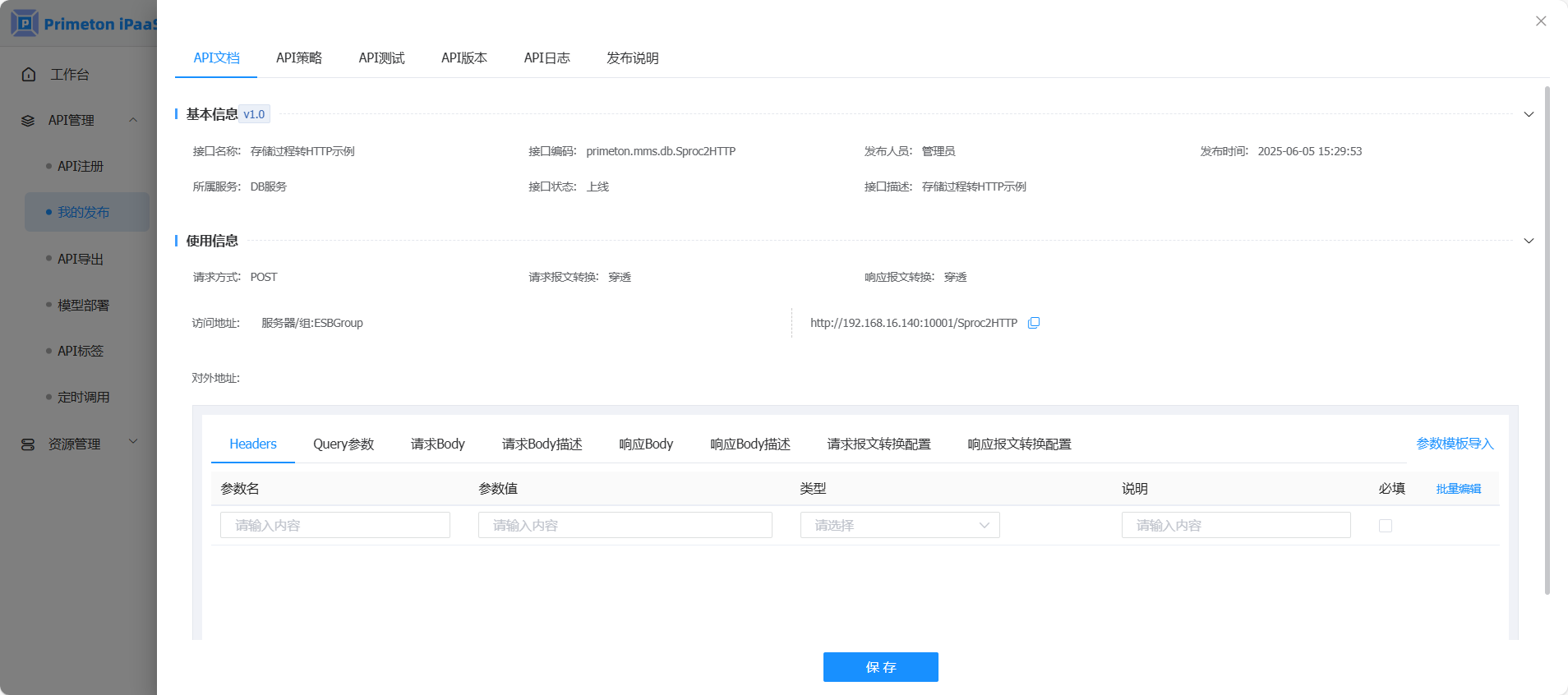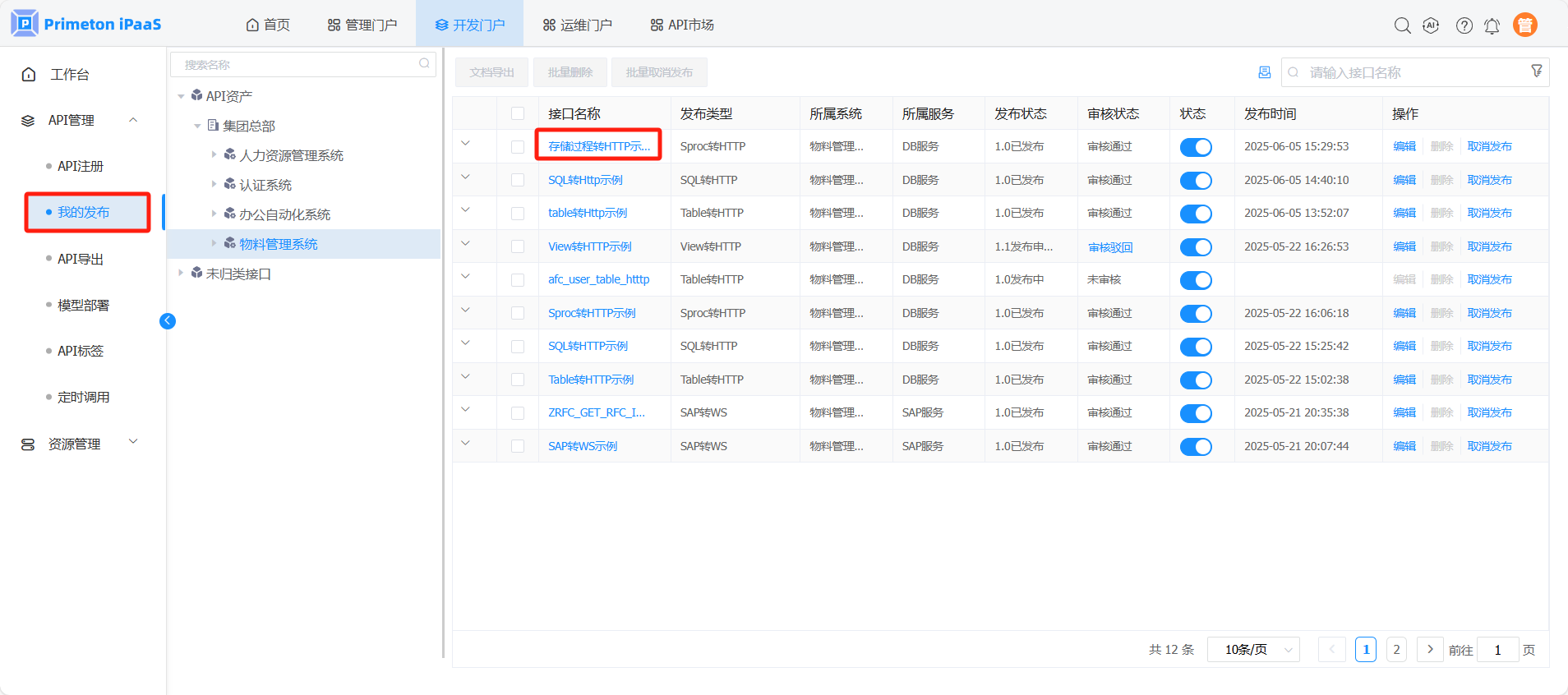 7. 进入开发门户,点击菜单“API管理”>"我的发布",进入“我的发布”页面,选择左侧组织树中本章节新增API的所属系统,在右侧界面可查看本章节创建的存储过程转HTTP接口的发布记录。