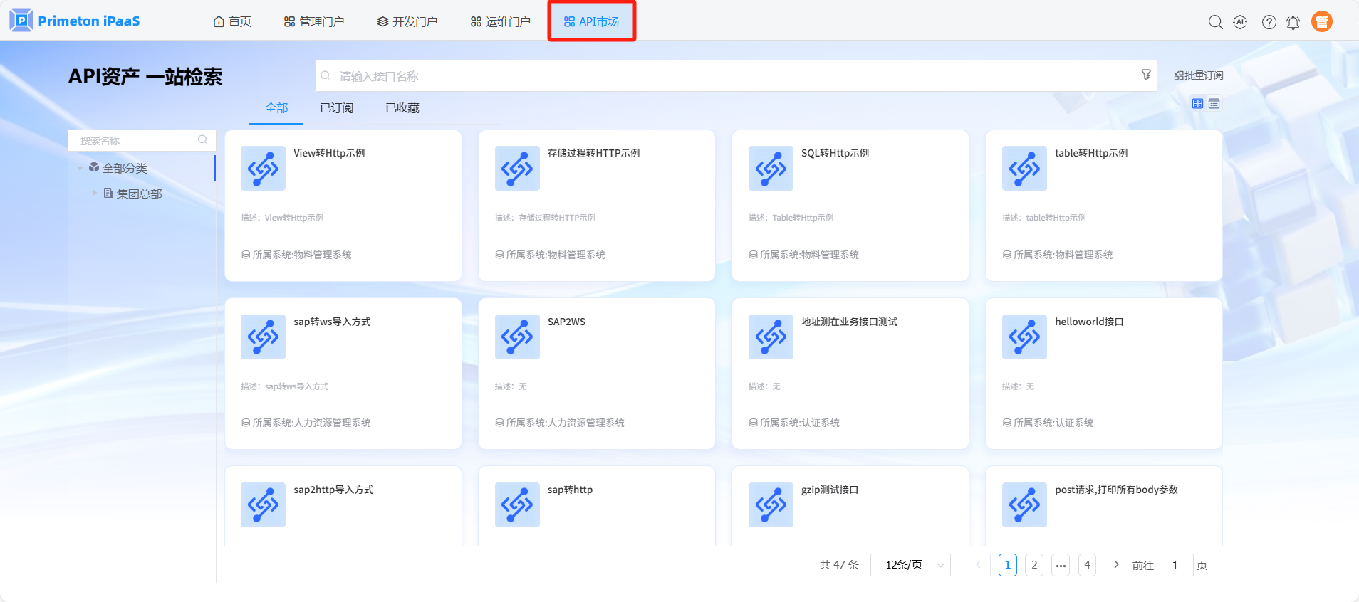 使用manager账号(默认密码:000000)登录系统,点击API市场,进入API市场。