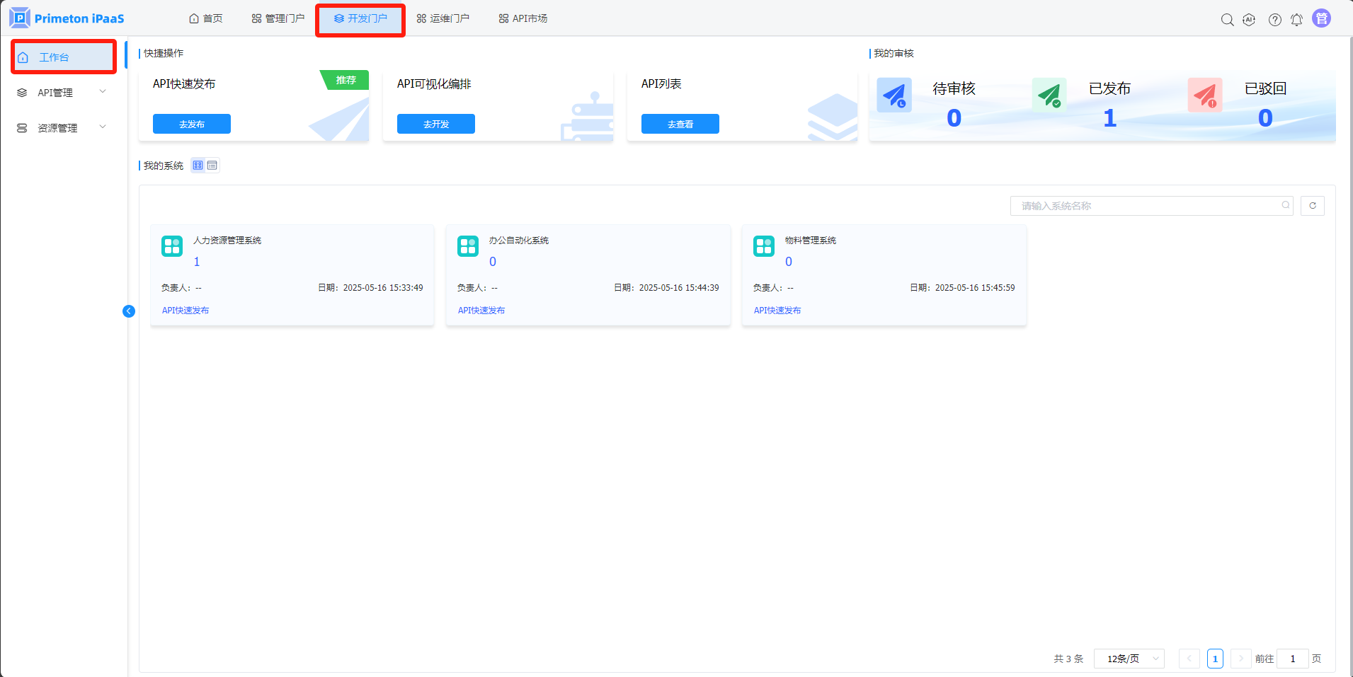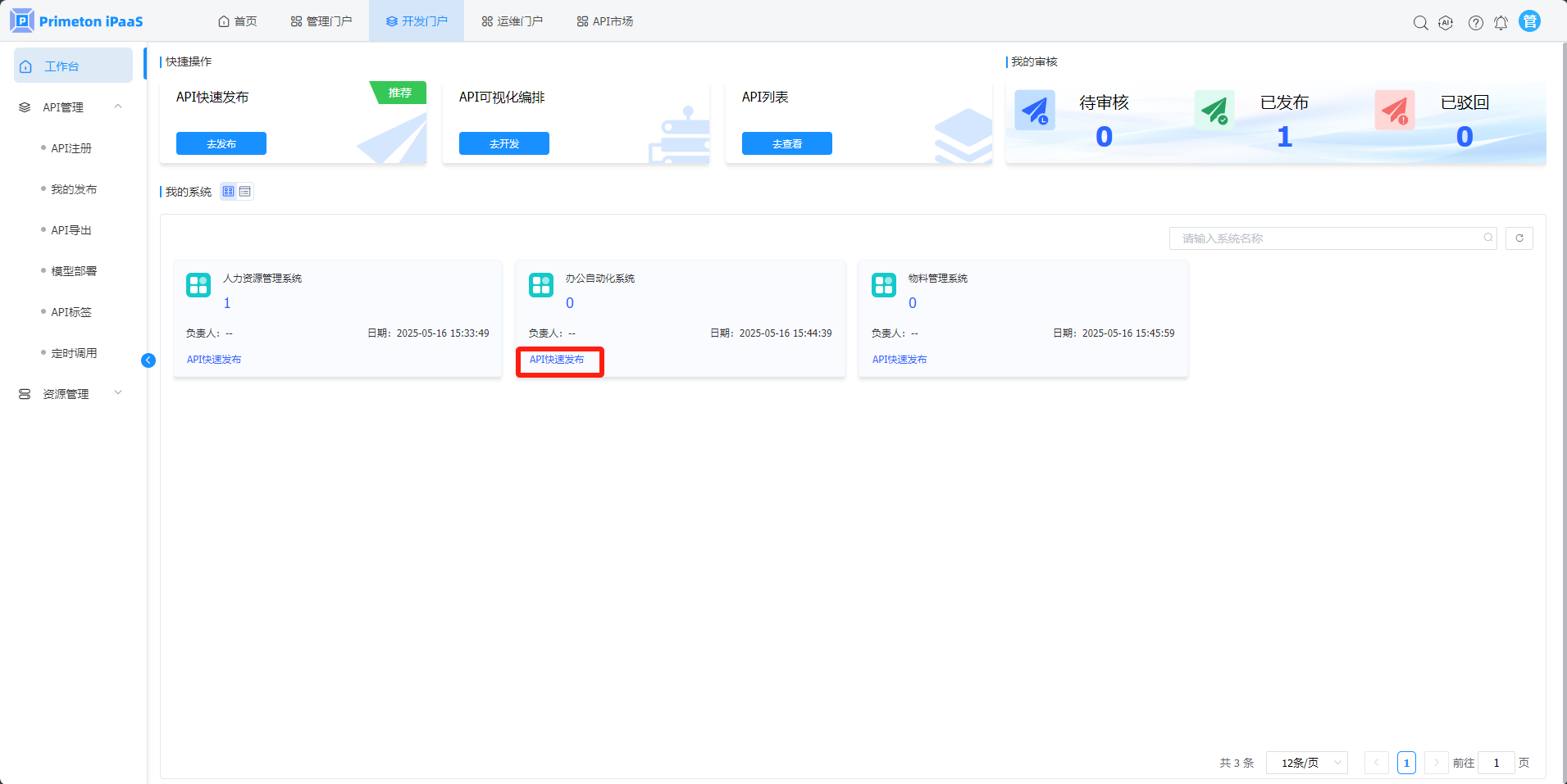 2.“工作台”页面,在“我的系统”页签中,点击系统卡片上的“API快速发布“按钮,弹出“API快速发布“弹窗。