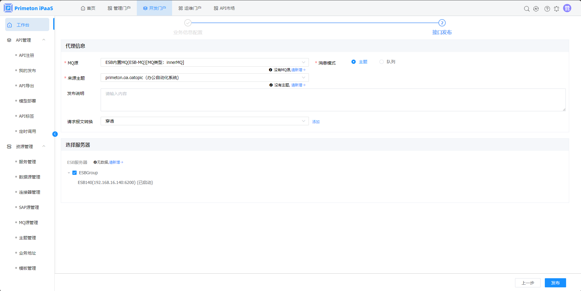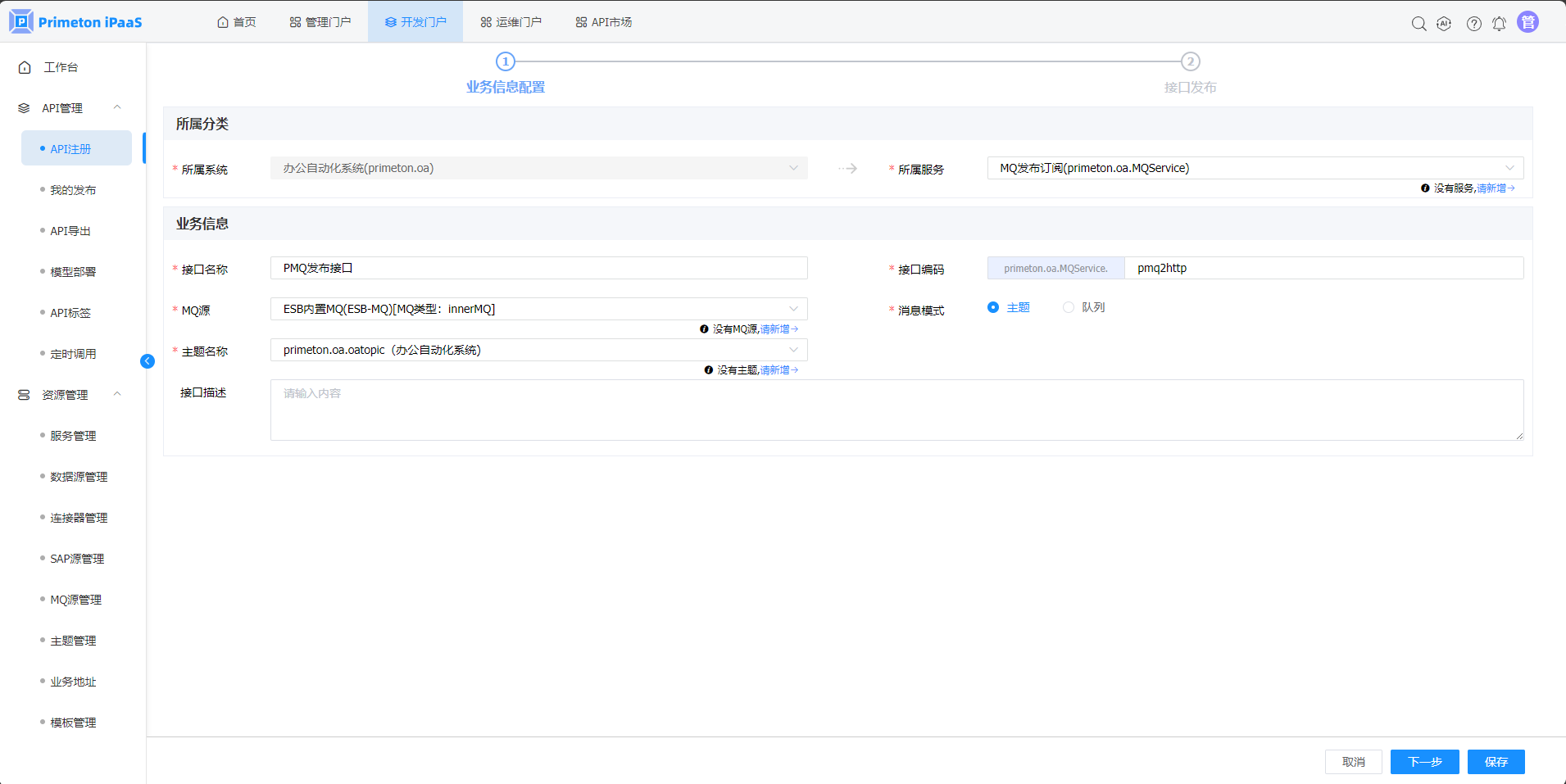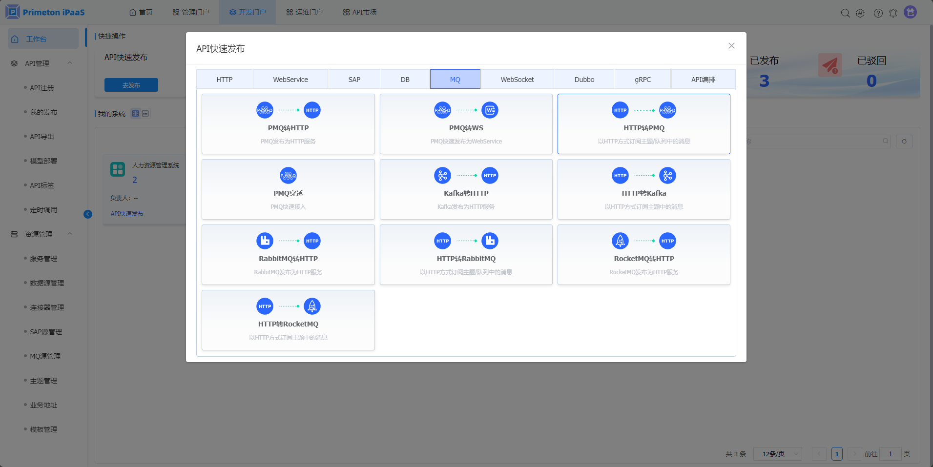 3.“API快速发布“弹窗,选择”MQ“页签,点击”PMQ转HTTP“按钮,进入”PMQ转HTTP“接口发布页面。
