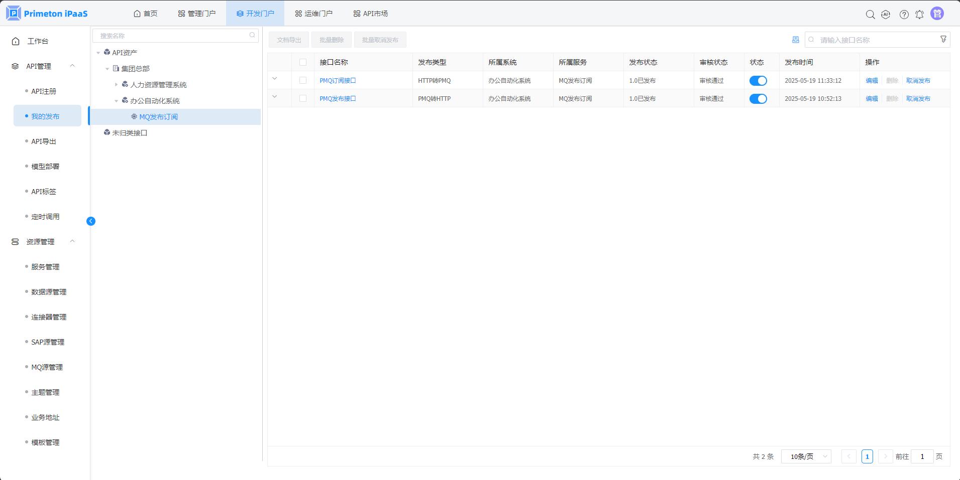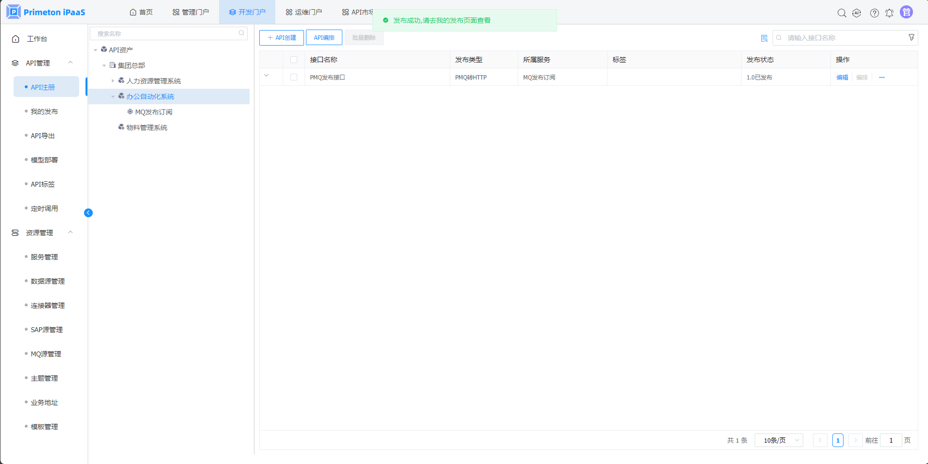 1.在"API管理">"我的发布"页面,可查看刚创建接口的发布记录。