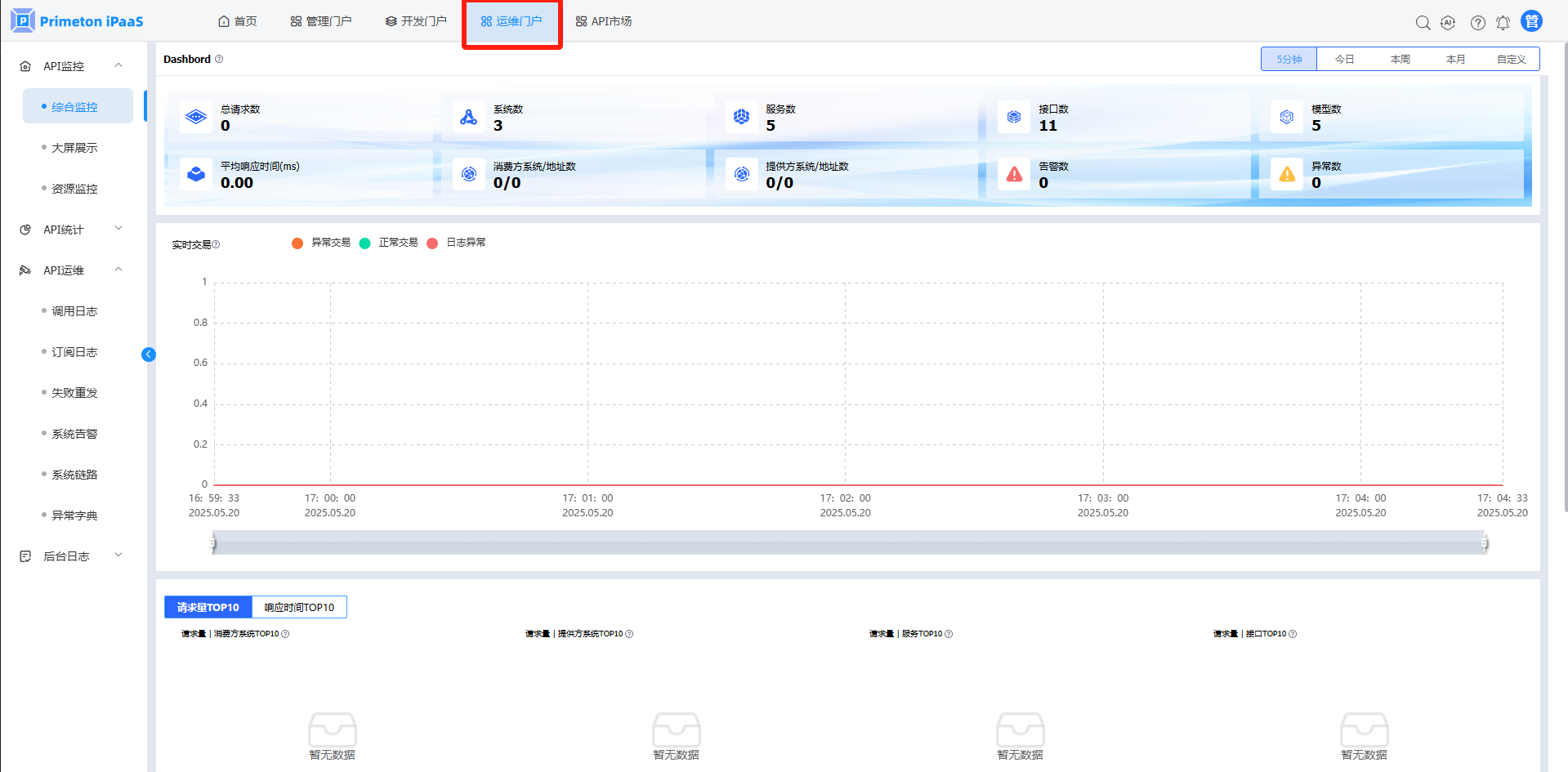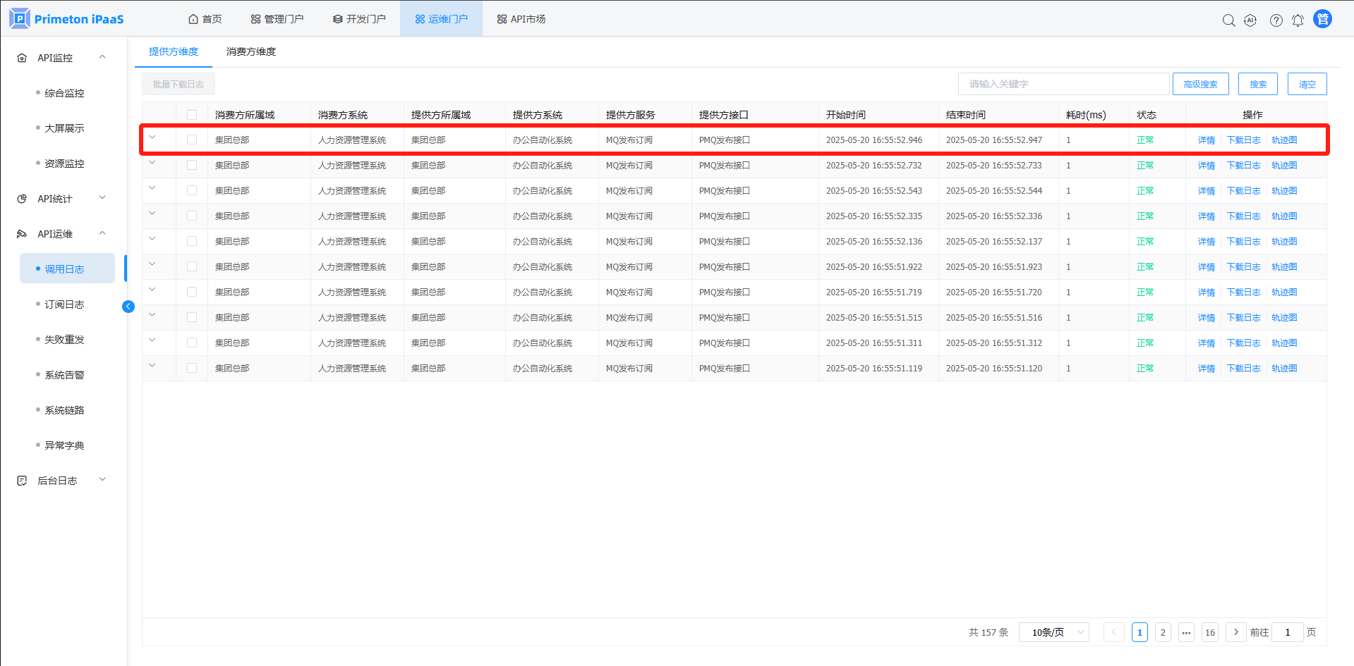 1. 点击菜单“API运维”>"调用日志",进入“调用日志”页面。