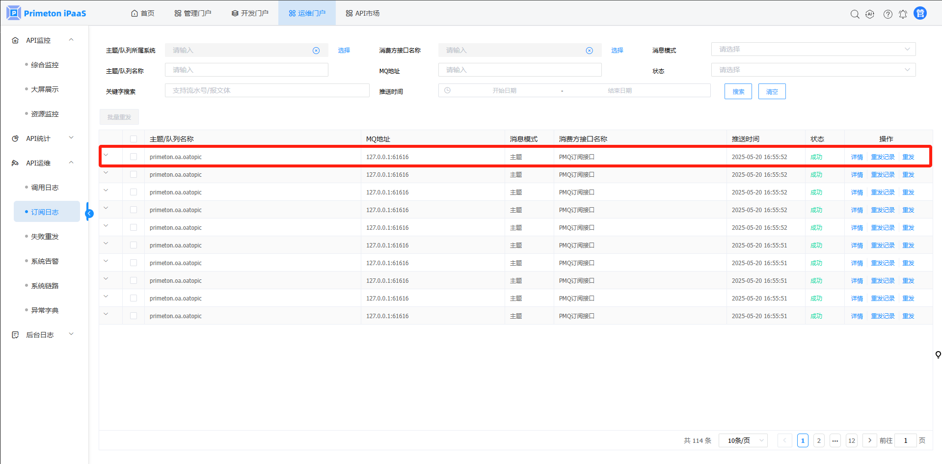 1. 点击菜单“API运维”>"订阅日志",进入“订阅日志”页面。