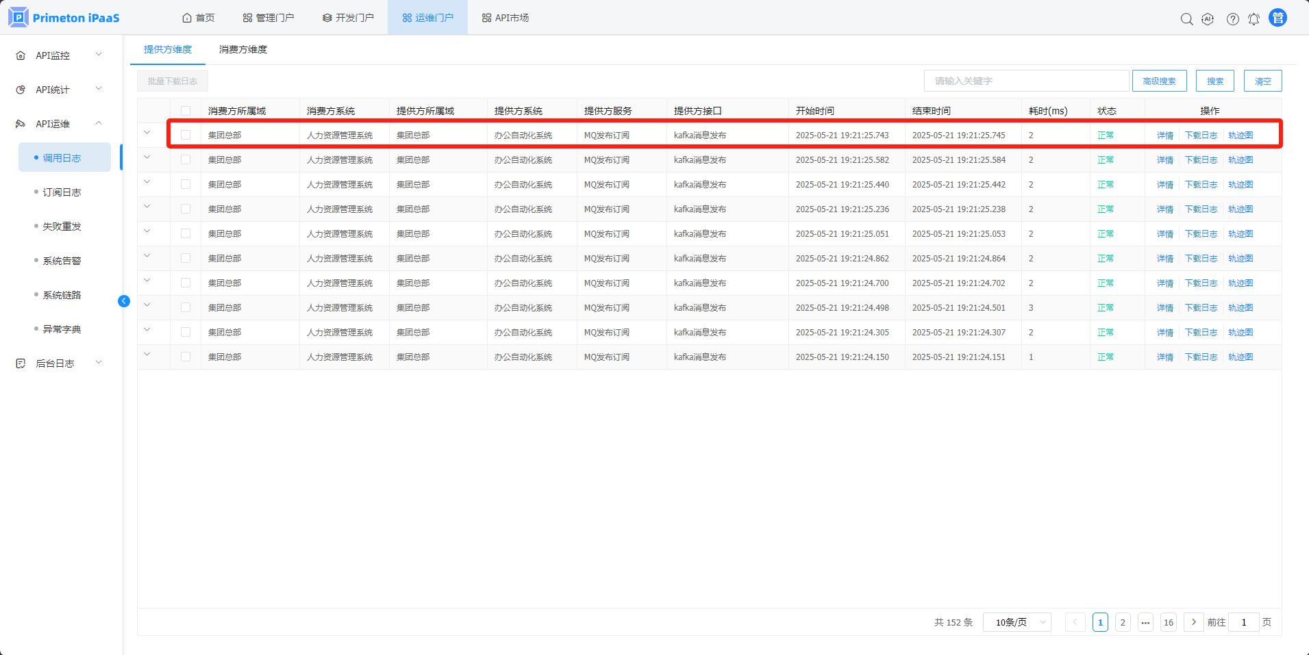 1. 点击菜单“API运维”>"调用日志",进入“调用日志”页面。