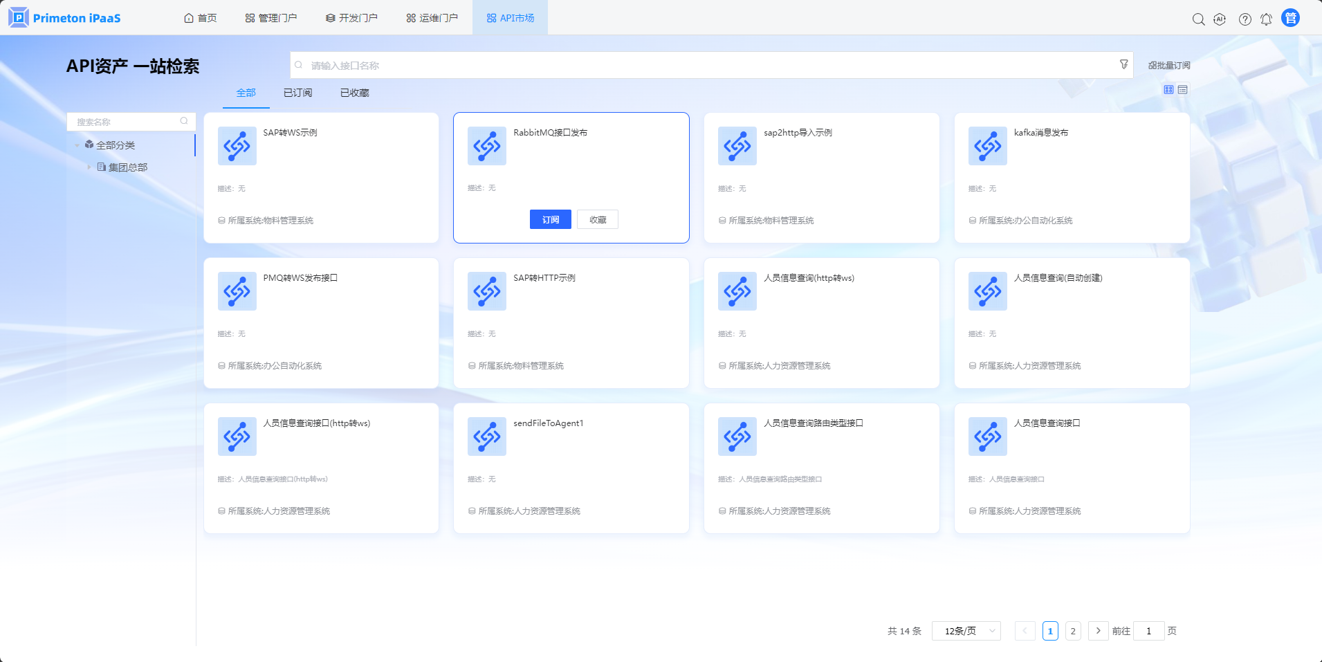 1.使用manager账号(默认密码:000000)登录系统,点击“API市场”,进入”全部“页签。