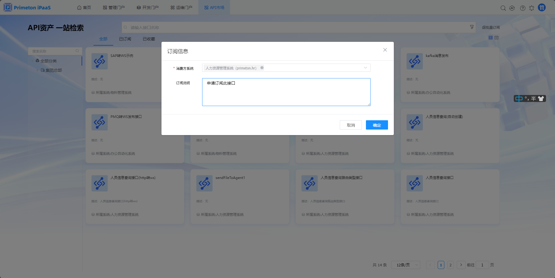 2.在“全部”页面,查看已发布的接口,点击”订阅”,申请订阅接口。