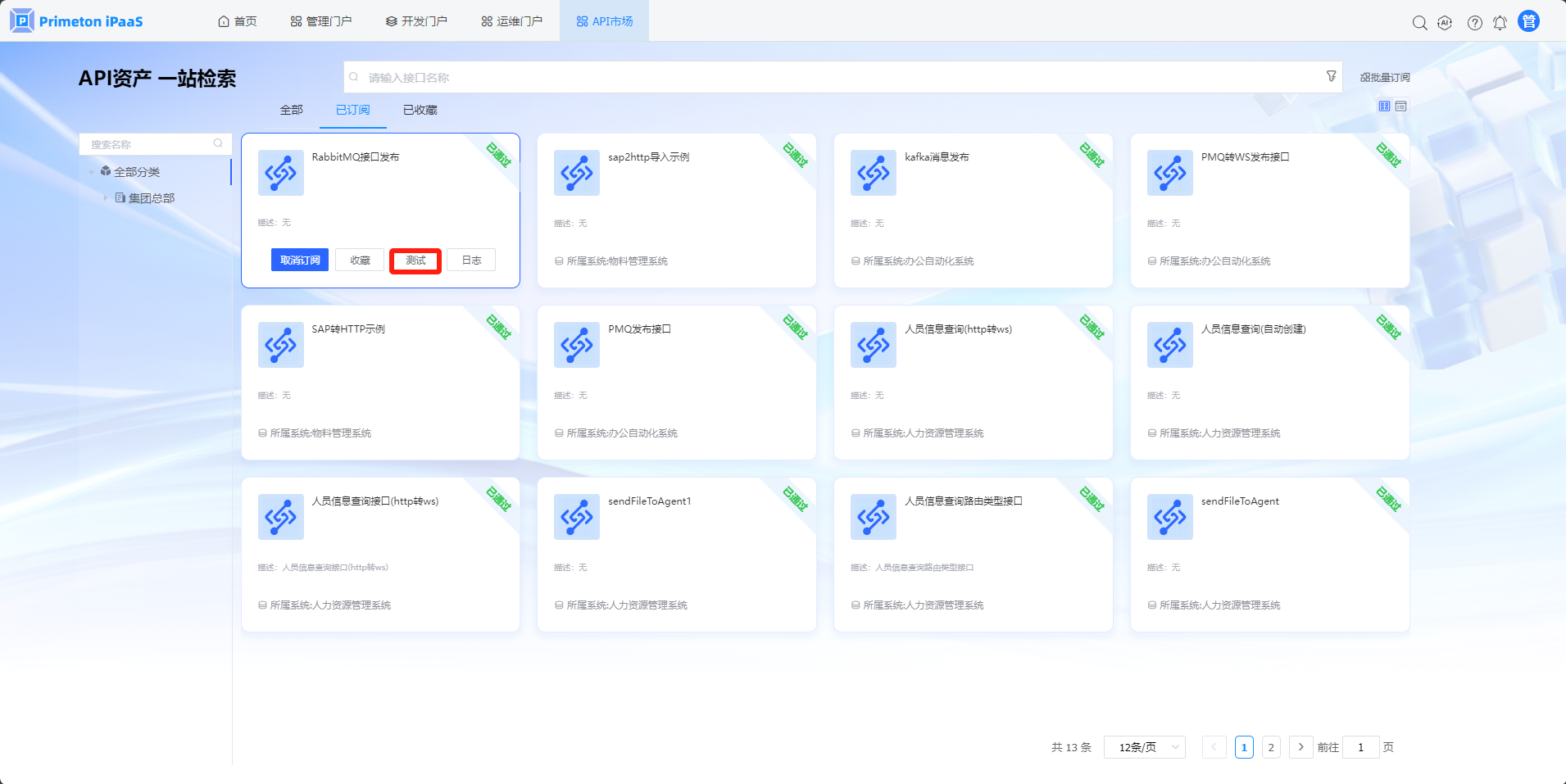 3.在“已订阅”页面,查看已订阅的接口,点击“测试”按钮,进入接口测试页面。