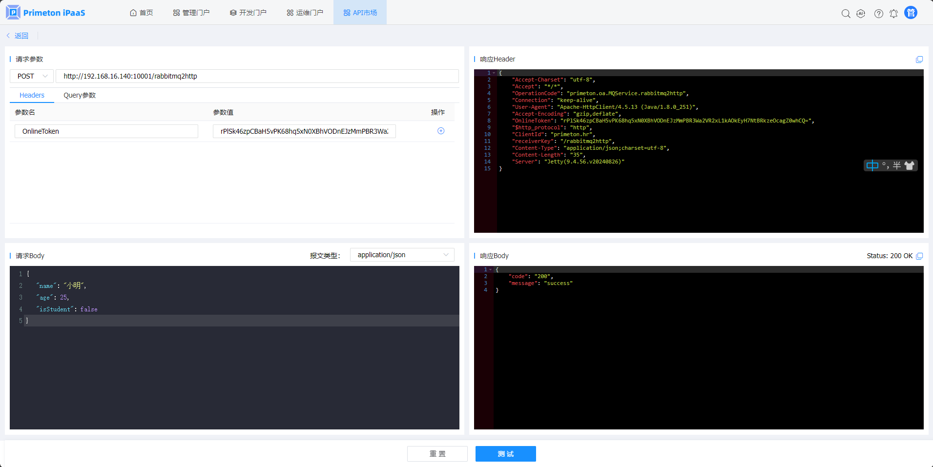 4.在“接口测试”页面,按业务接口的需求,填写访问配置项,点击“测试”按钮,进行接口测试。