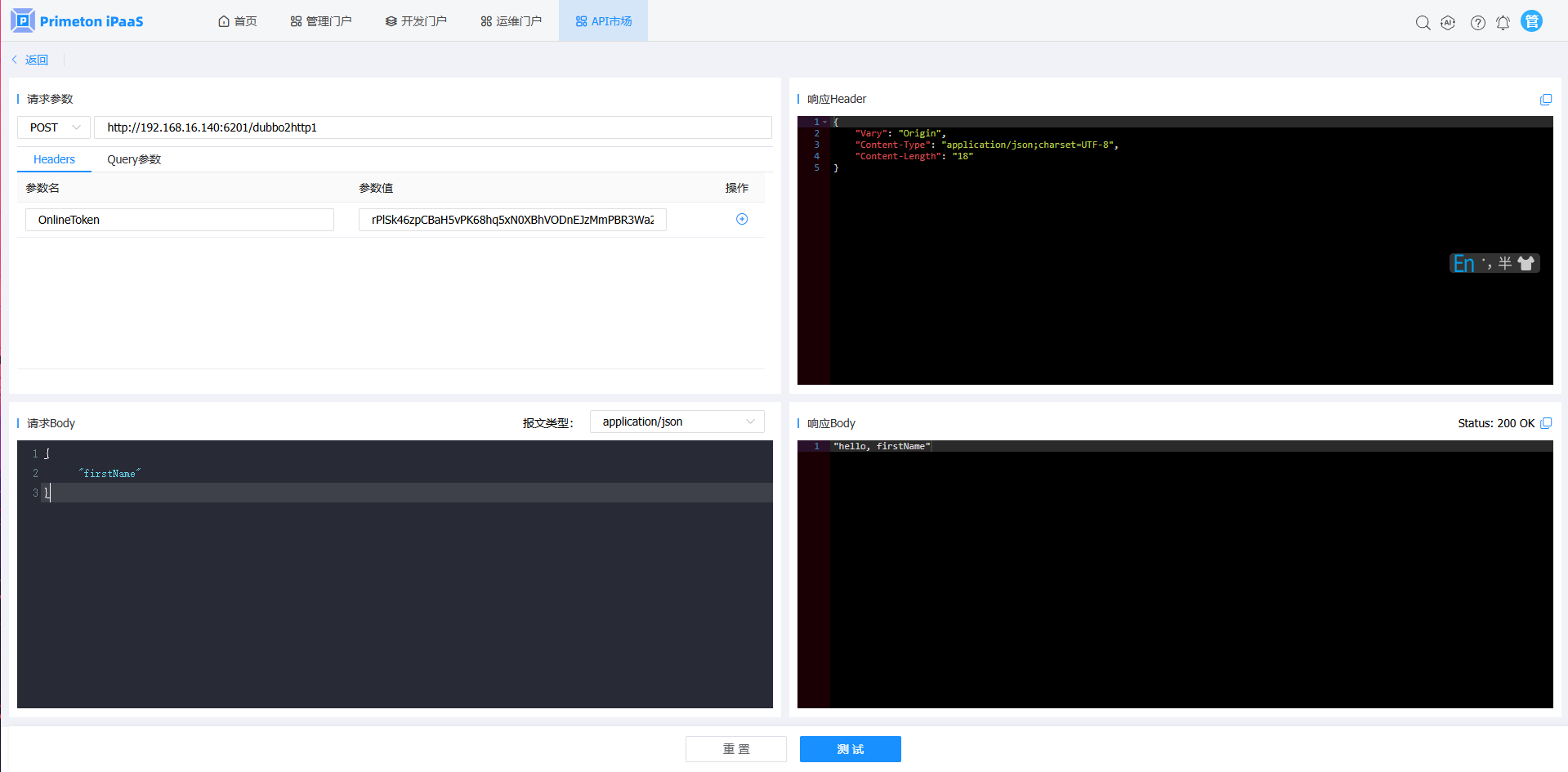 4.在“接口测试”页面,按业务接口的需求,填写访问配置项,点击“测试”按钮,进行接口测试。
