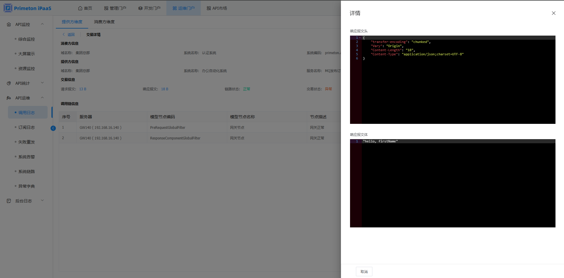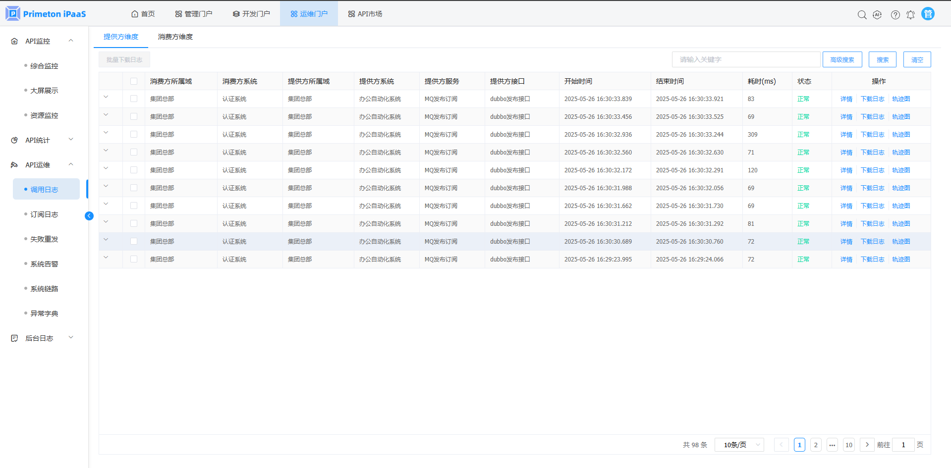 点击菜单“API运维”>"调用日志",进入“调用日志”页面。