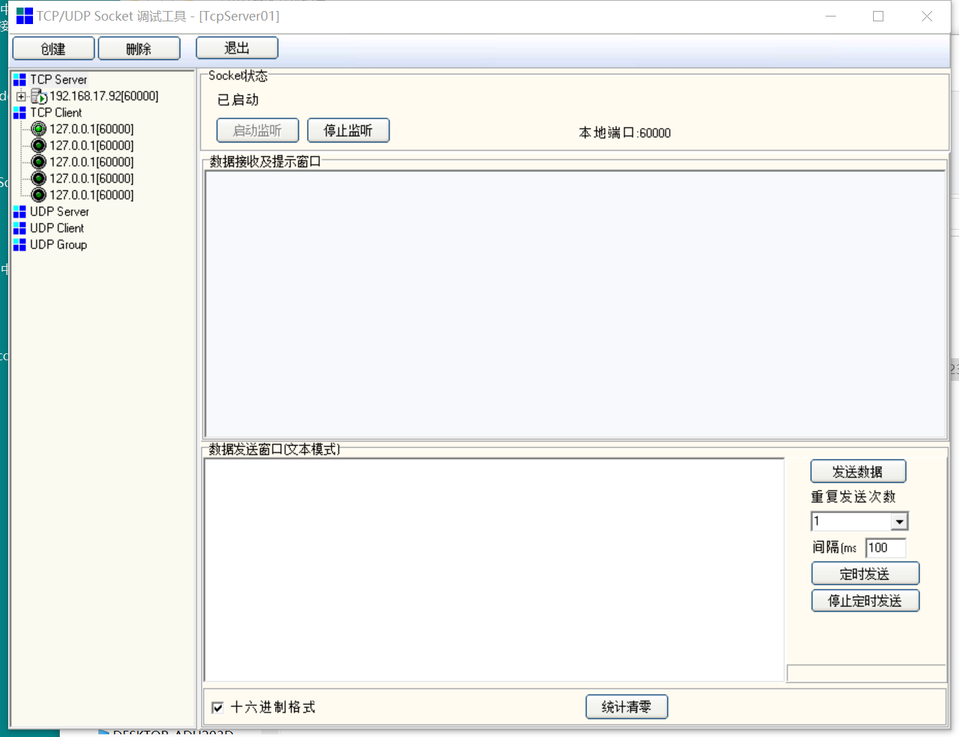 3. 点击新建的UDP Server,取消下方的十六进制格式的复选框,这样就可以收发中文。如下图: