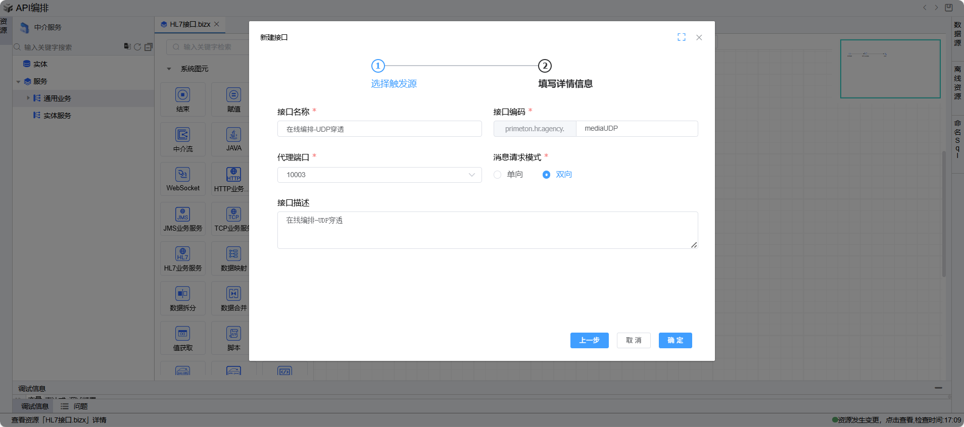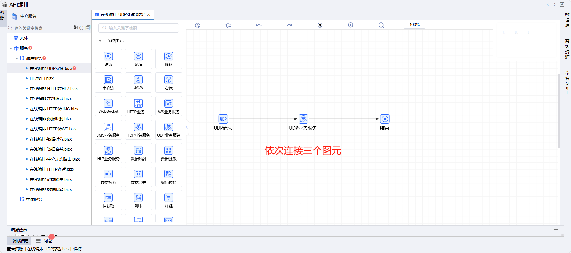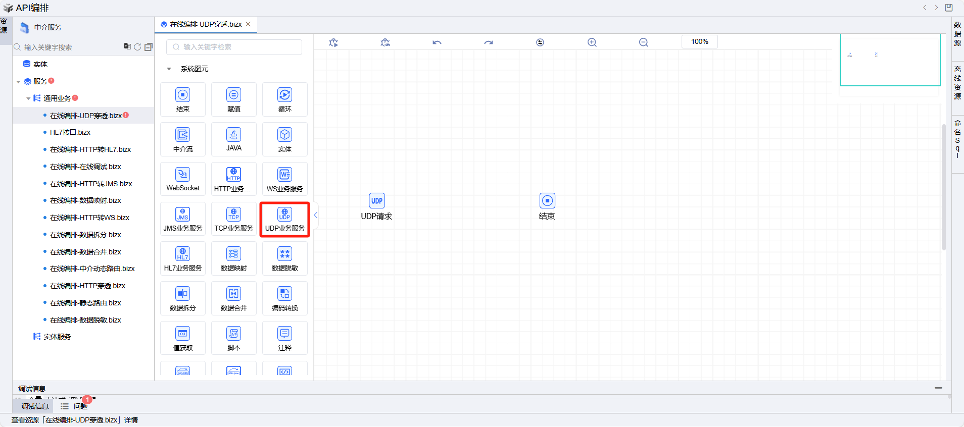 保存成功后系统自动打开中介编排页面,如下图所示。从左侧拖一个UDP业务服务图元到编辑区域。