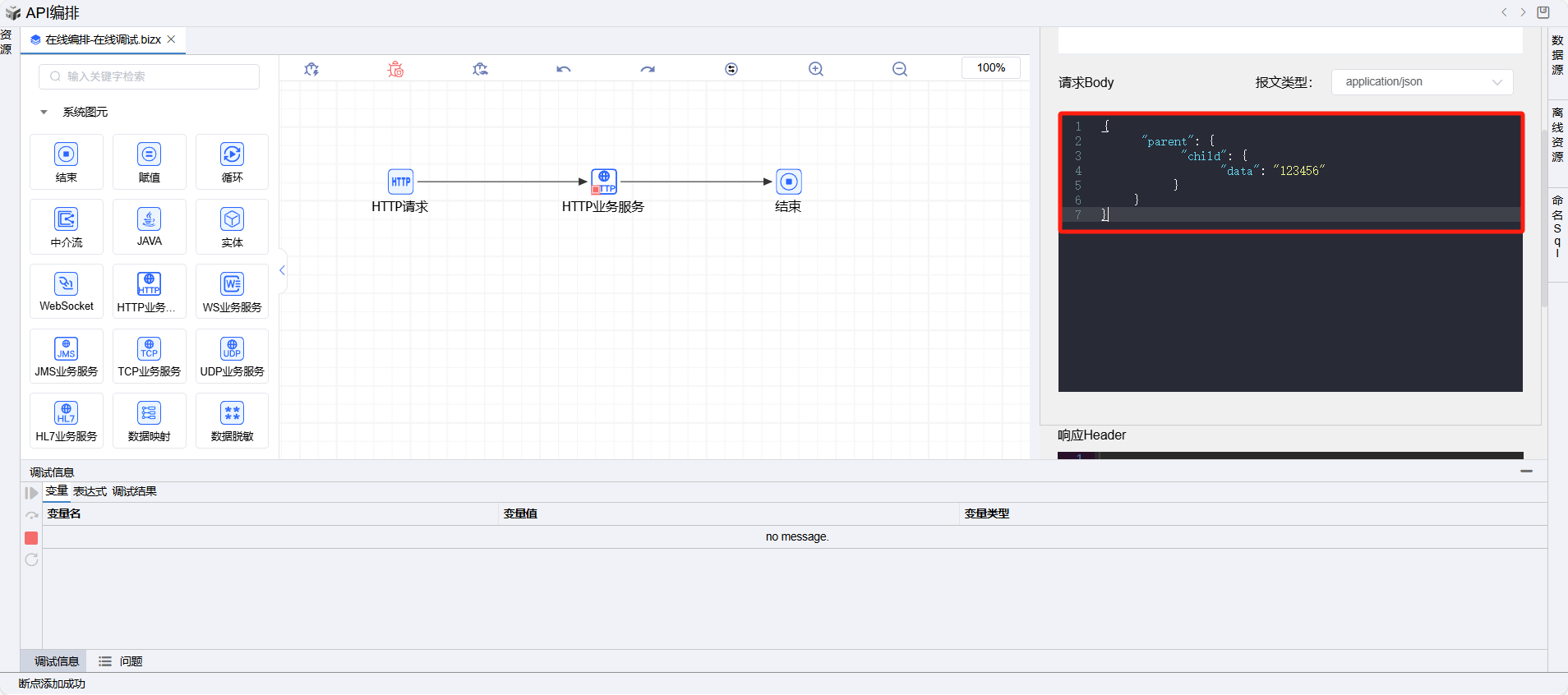 点击测试后,可以看到在线编排页面,已经来到第一个断点,可在“变量”界面查看当前变量信息。