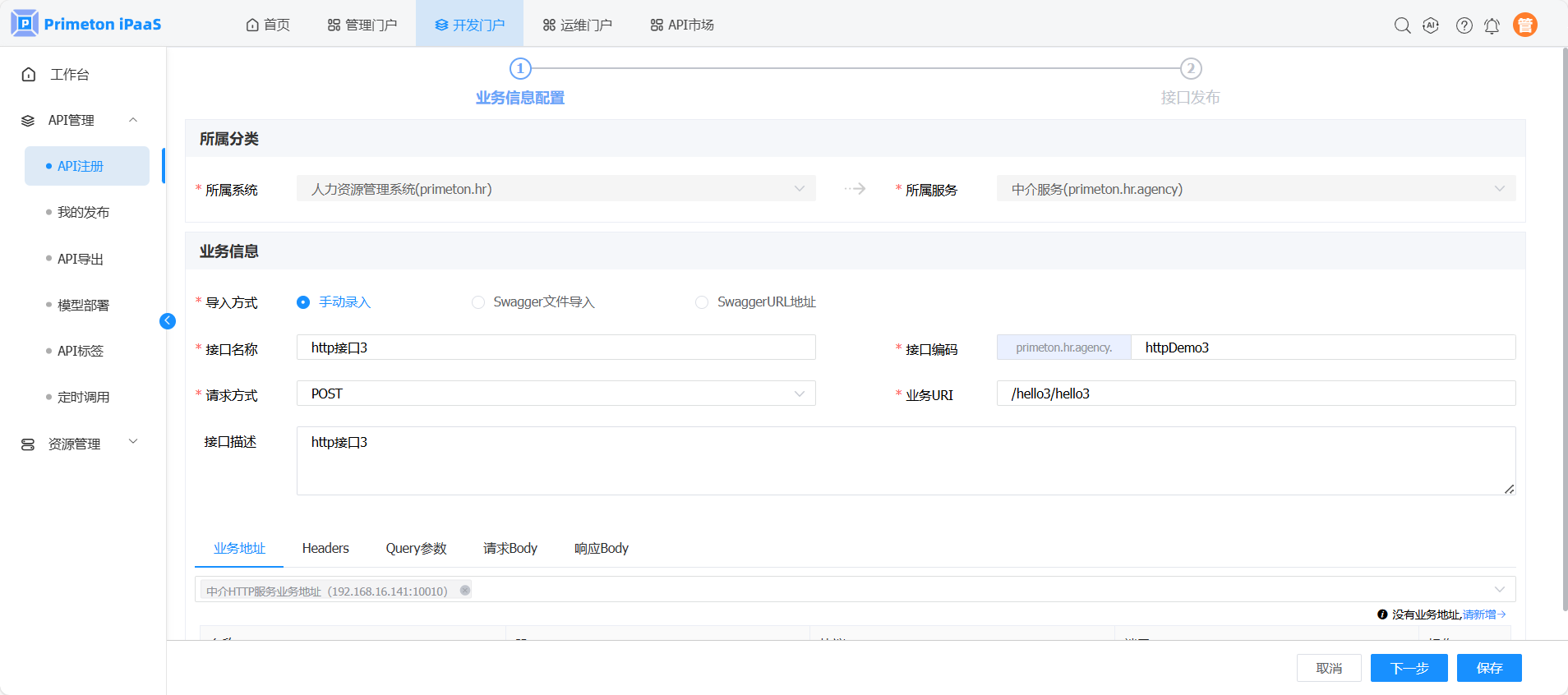 2. 使用manager账号(默认密码:000000)登录系统,点击开发门户,进入"资源管理">"业务地址"页面,