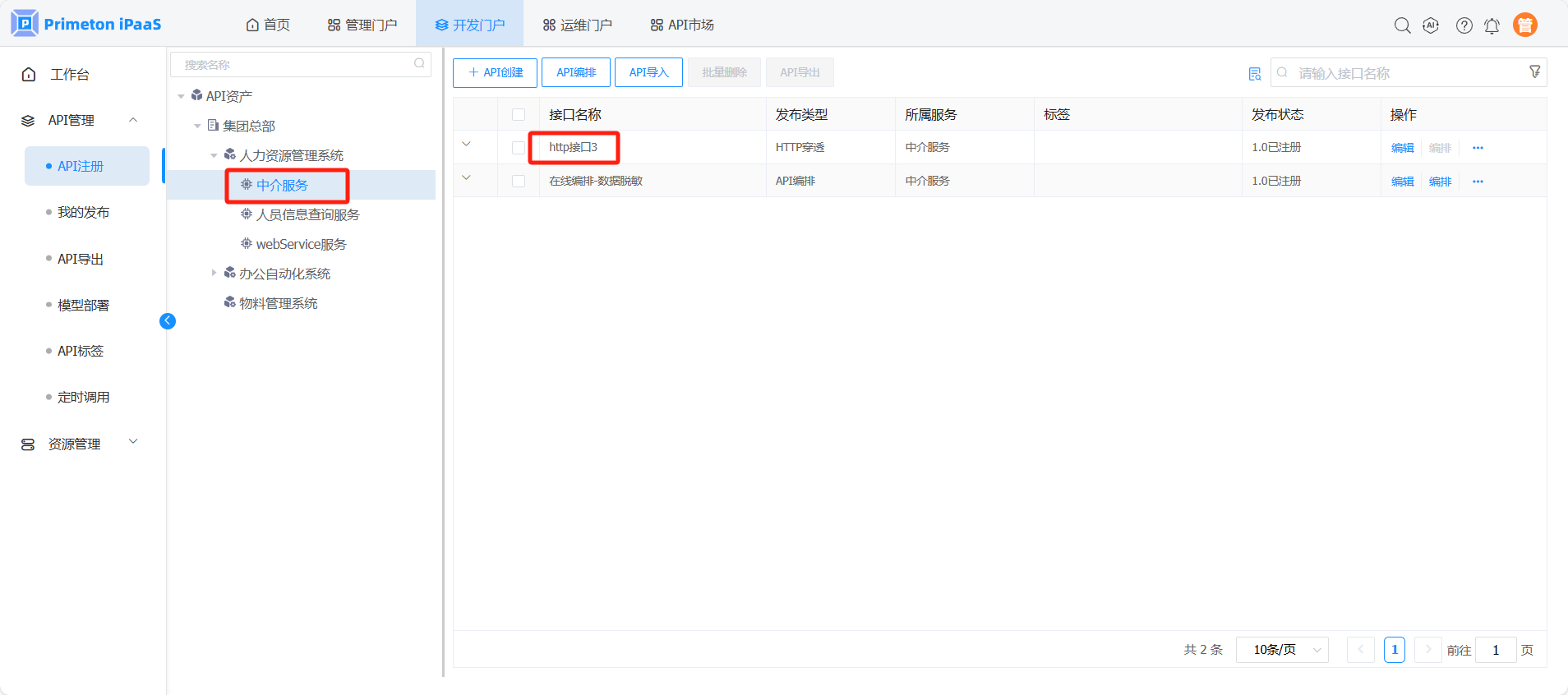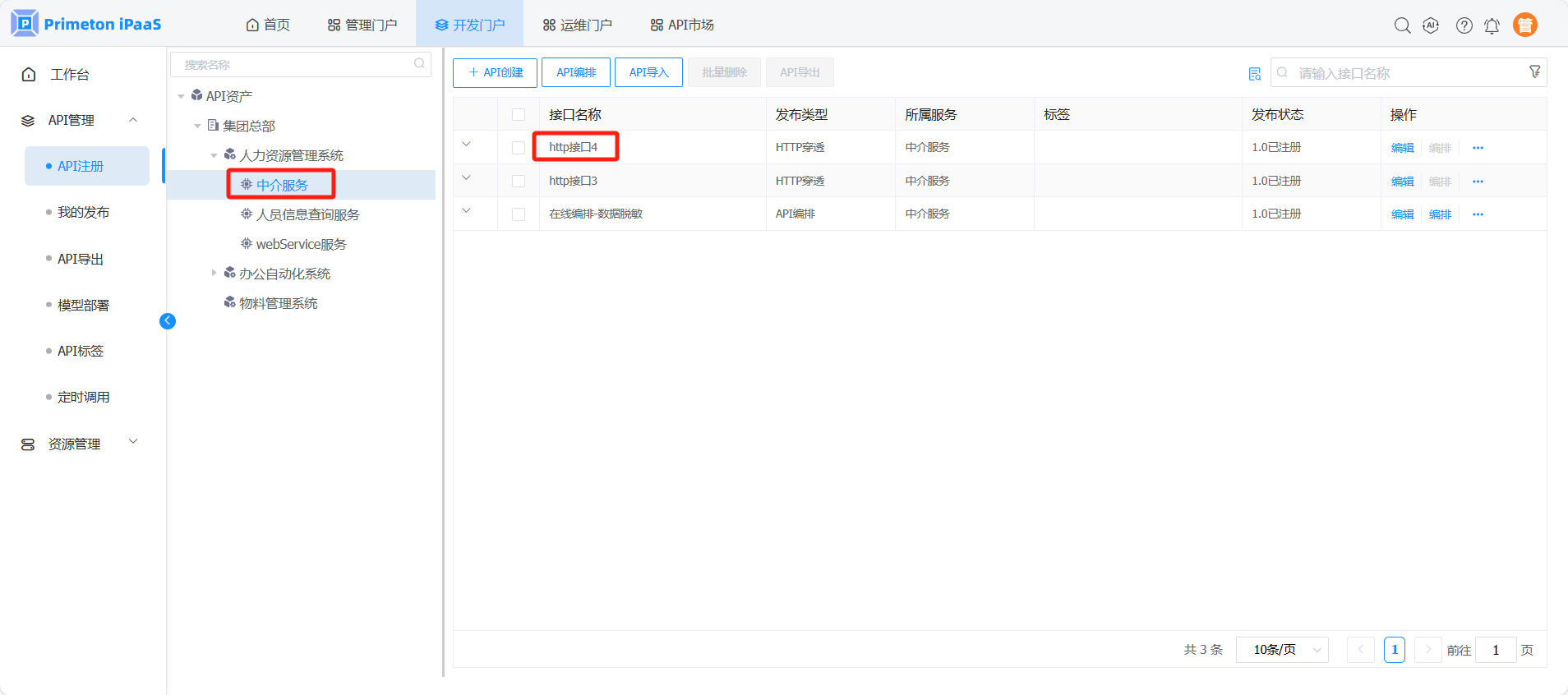4. 进入“API管理”>“API注册”页面,可查看上步骤创建的“http接口3”业务接口记录。