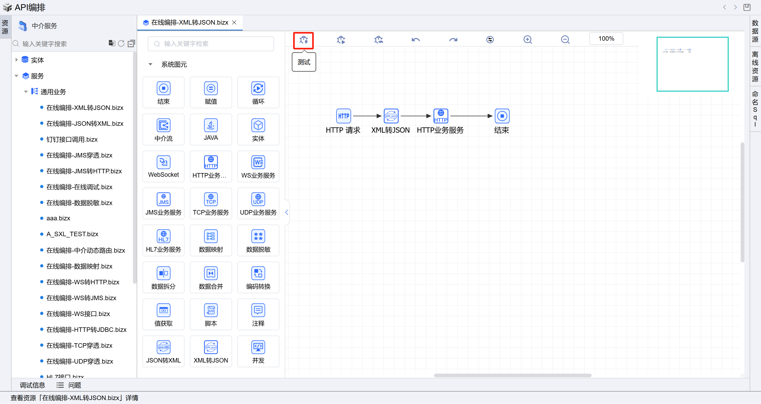 - 在线编排页面保存成功后,点击界面上方的测试按钮,如下图: