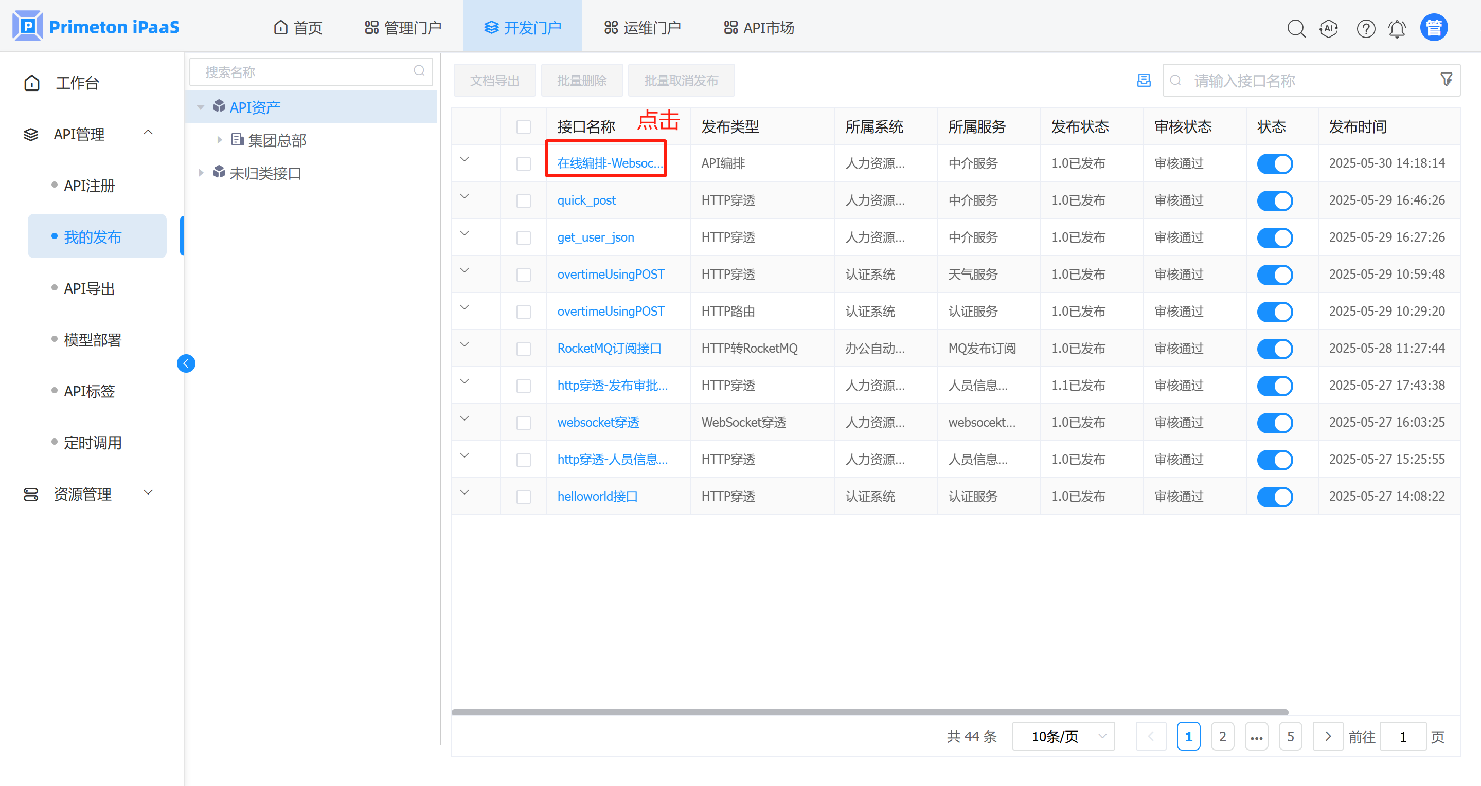 - 点击“开发门户” > “我的发布” 菜单,进入接口发布页面,找到刚才发布的接口,点击“接口名称”,即可查看接口详情。如下图: