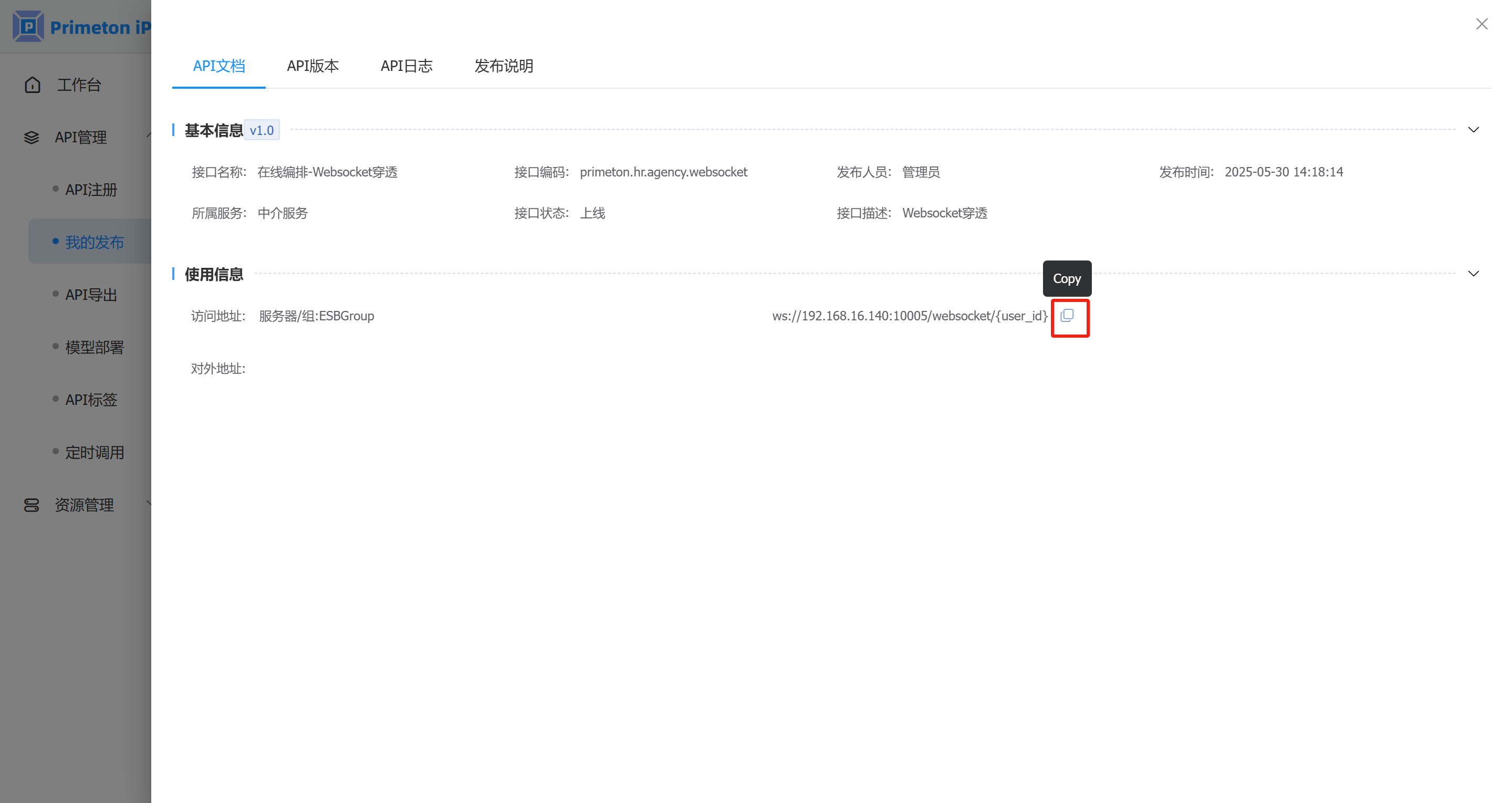 - 在接口详情页面,默认进入“API文档”标签页,可以看到接口的基本信息、使用信息。点击使用信息中的“复制”按钮,复制接口调用地址。如下图: