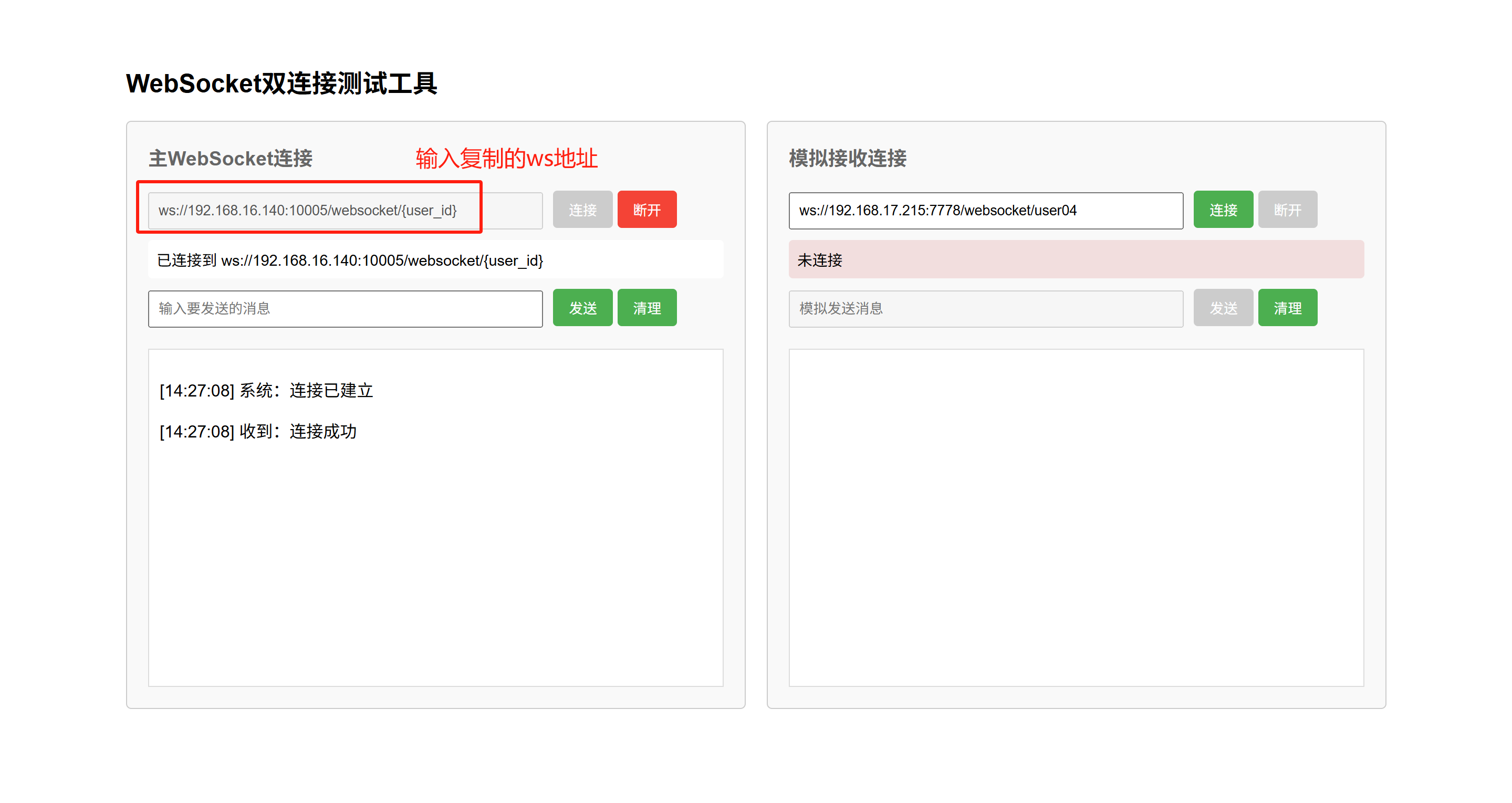 主WebSocket连接输入接口调用地址,点击“连接”按钮,即可连接到接口。如下图: